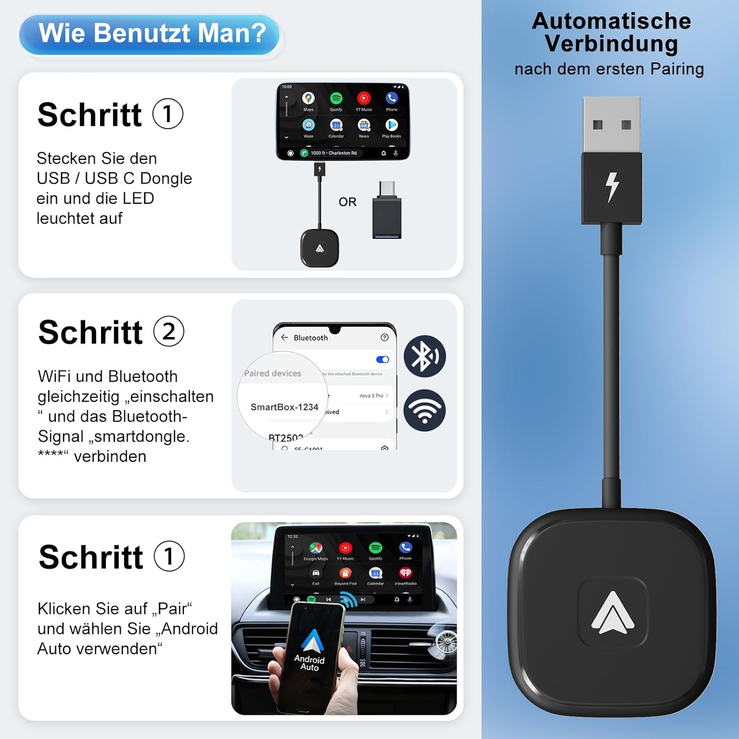 • 【Plug and Play】Просто включете безжичния Android Auto адаптер в USB/Type-C порта на колата си и светодиодът на адаптера ще светне. Включете Bluetooth и Wi-Fi на вашето Android устройство (и двете трябва да са активирани едновременно) и след това потърсете Android Auto адаптера, с който да се свържете. След първоначалната настройка устройството ще се включи автоматично, когато стартирате двигателя на колата си, и бързо ще се свърже с вашето Android устройство.