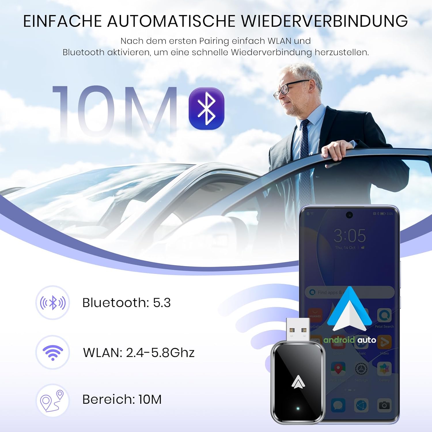 • 【Лесно свързване и автоматично повторно свързване】Свържете адаптера само в 3 лесни стъпки: Включване → Сдвояване → Възпроизвеждане. След първоначалното сдвояване, вашият Android смартфон ще се свързва безпроблемно и автоматично с Wireless Android Auto всеки път, когато стартирате колата си. С бързото време за стартиране и плавното автоматично повторно свързване, можете да потеглите веднага, без да чакате.