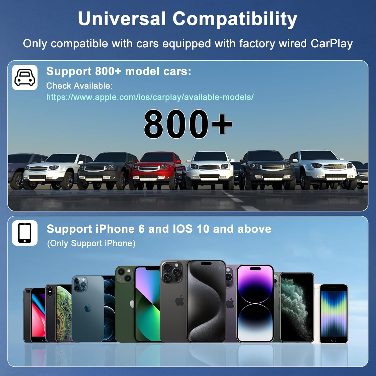 • 【Съвместими автомобили с OEM CarPlay】Търсите ли безжичен CarPlay адаптер за iPhone, който работи с широка гама от модели автомобили? Този безжичен CarPlay адаптер за iPhone е съвместим с над 600 модела автомобили, оборудвани с OEM кабелен CarPlay. Поддържани iPhone-и: iPhone 6 и по-нови модели и iOS версия 11 и по-нова.