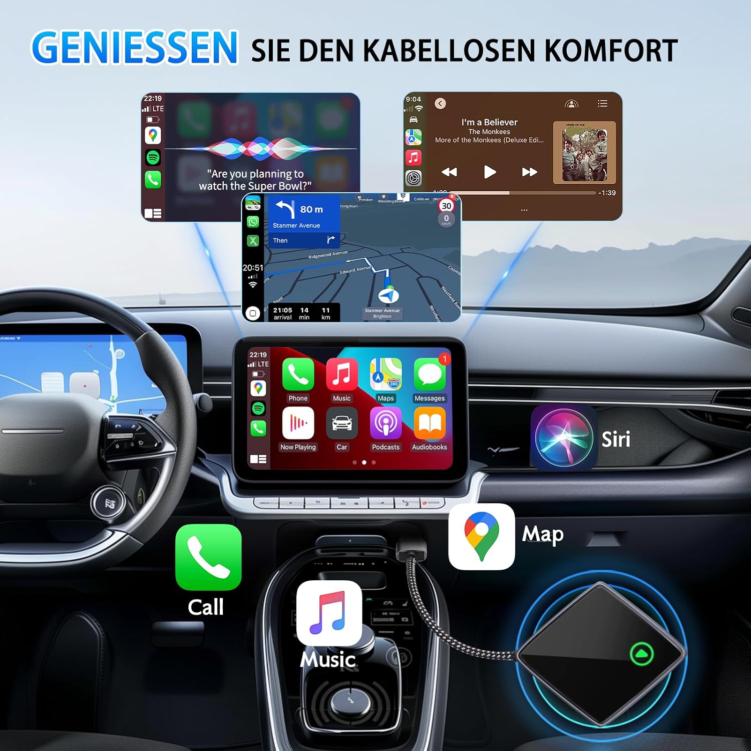 • 【Многофункционален безжичен адаптер CarPlay】 Поддържа навигация, гласов асистент, музика, телефонни разговори, съобщения и др. Управлението е удобно чрез глас, сензорен екран, бутони или въртящ се диск. За плавна и безжична работа без компромис с безопасността или системите на превозното средство. За по-интелигентно и по-комфортно шофиране.