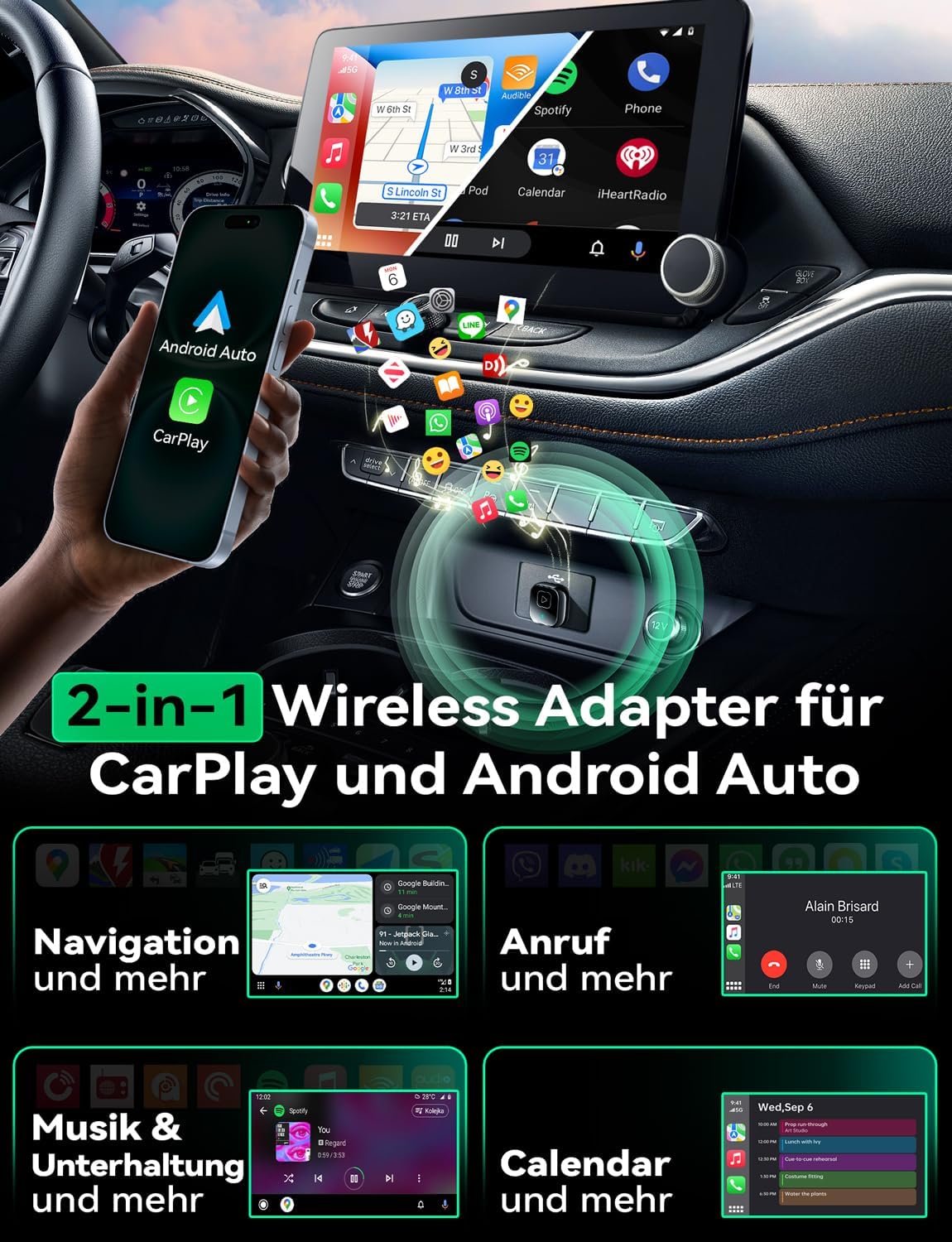 • Двубандова супер производителност – С двубандов чипсет 2.4 GHz + 5 GHz за 100% подобрена производителност, нашият адаптер осигурява подобрена стабилност и практически никаква латентност. Изпитайте светкавично бърза и плавна производителност на CarPlay/Android Auto за безпроблемно стриймване на музика, навигация и разговори със свободни ръце.
