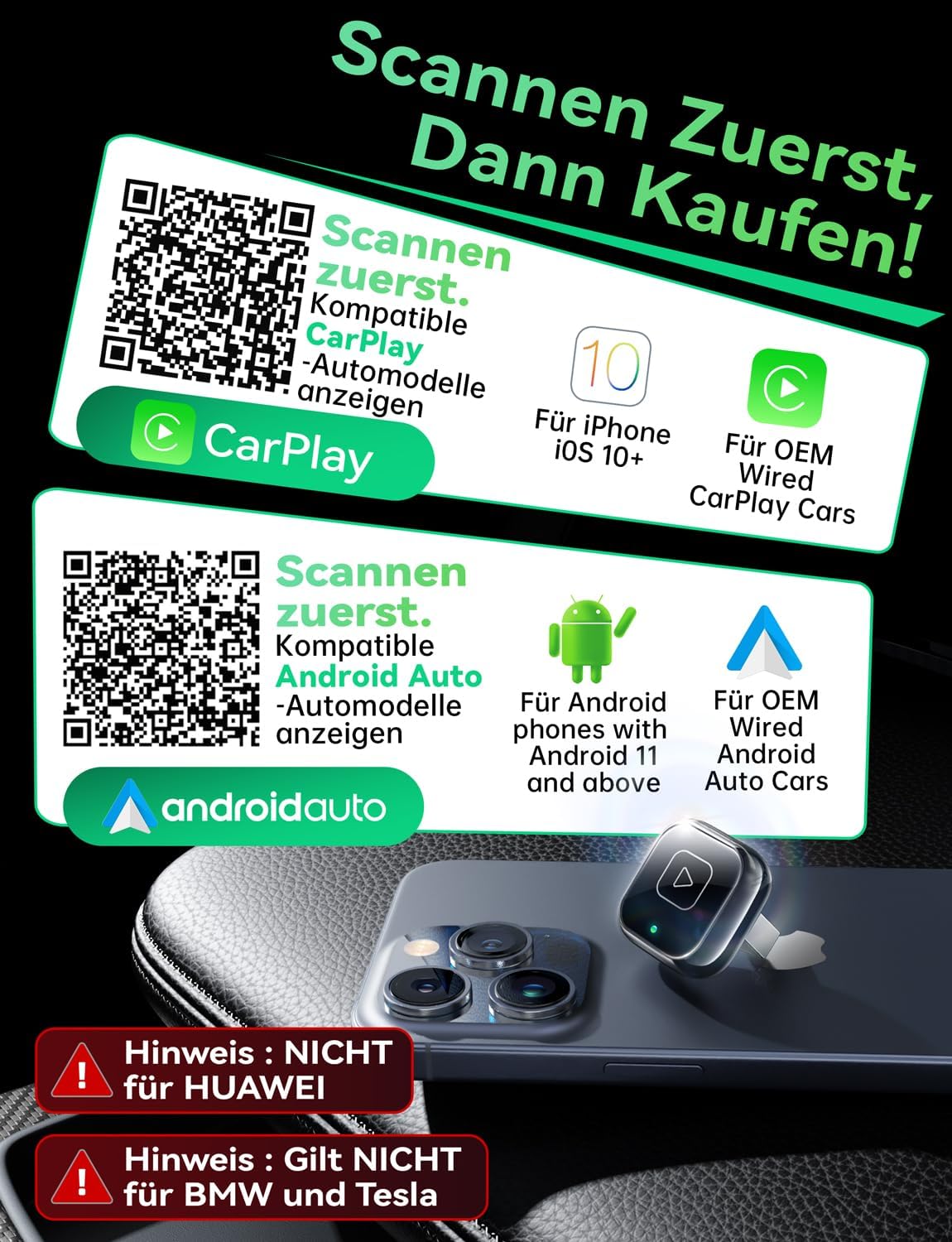• САМО за автомобили с фабрично инсталиран Wired CarPlay/Android Auto – Не е съвместим с автомобили, които не поддържат Wired CarPlay/Android Auto. Работи с 98% от фабрично инсталираните Wired CarPlay/Android Auto системи. Поддържа iPhone 6 и по-нови версии, iOS 10 и по-нови версии и Android 11 и по-нови версии. Включва USB-A и USB-C адаптери, за да се осигури съвместимост с повечето USB портове на автомобила. (Не е за телефони Huawei/BMW/Tesla)