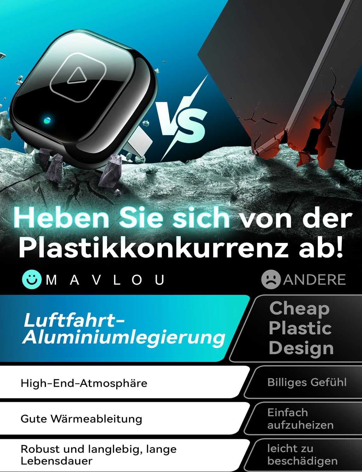 • ️ Ефективно разсейване на топлината – Прегряване? Никога повече! – Откройте се от конкуренцията с пластмасови продукти! Безжичният адаптер Mavlou е подобрен въз основа на обширна обратна връзка от потребителите и разполага с прецизно обработен алуминиев корпус. Дори при дълги пътувания или по време на интензивна употреба, той поддържа комфортна, стабилна температура, осигурявайки абсолютна безопасност и постоянно оптимална производителност. Освен това добавя нотка лукс към вашето табло. Компактният корпус (2,6 см x 2,6 см) и балансираното тегло гарантират, че адаптерът остава сигурно свързан, дори по неравни пътища.