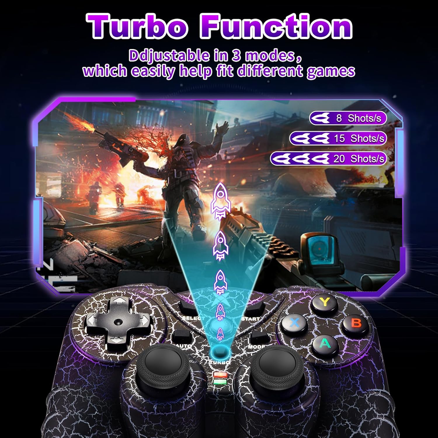 • Двойна вибрация и турбо функция: с този геймпад можете да контролирате посоката на играта и перспективата на героя чрез разпознаване на вибрации. Той осигурява точна обратна връзка за вибрациите на ръката при всеки удар и сблъсък, така че наистина да се потопите в играта и да имате незабравимо изживяване. Бутонът турбо предлага 3 скорости на серийно изстрелване: 5 изстрела/сек, 12 изстрела/сек, 20 изстрела/сек, за да можете да печелите различни игри по-лесно.