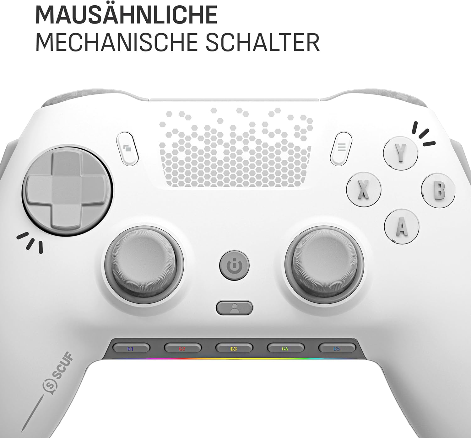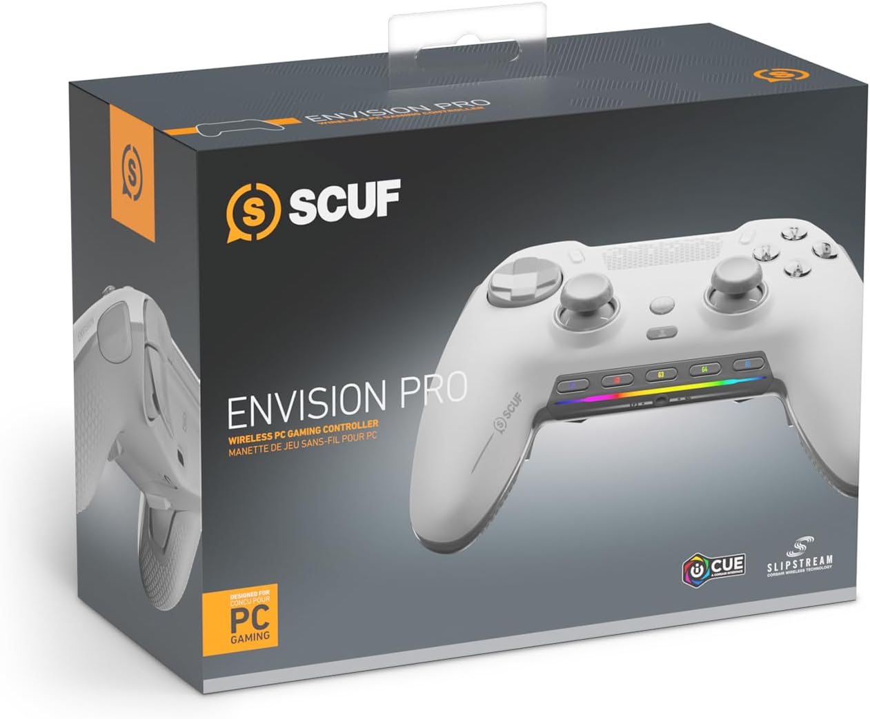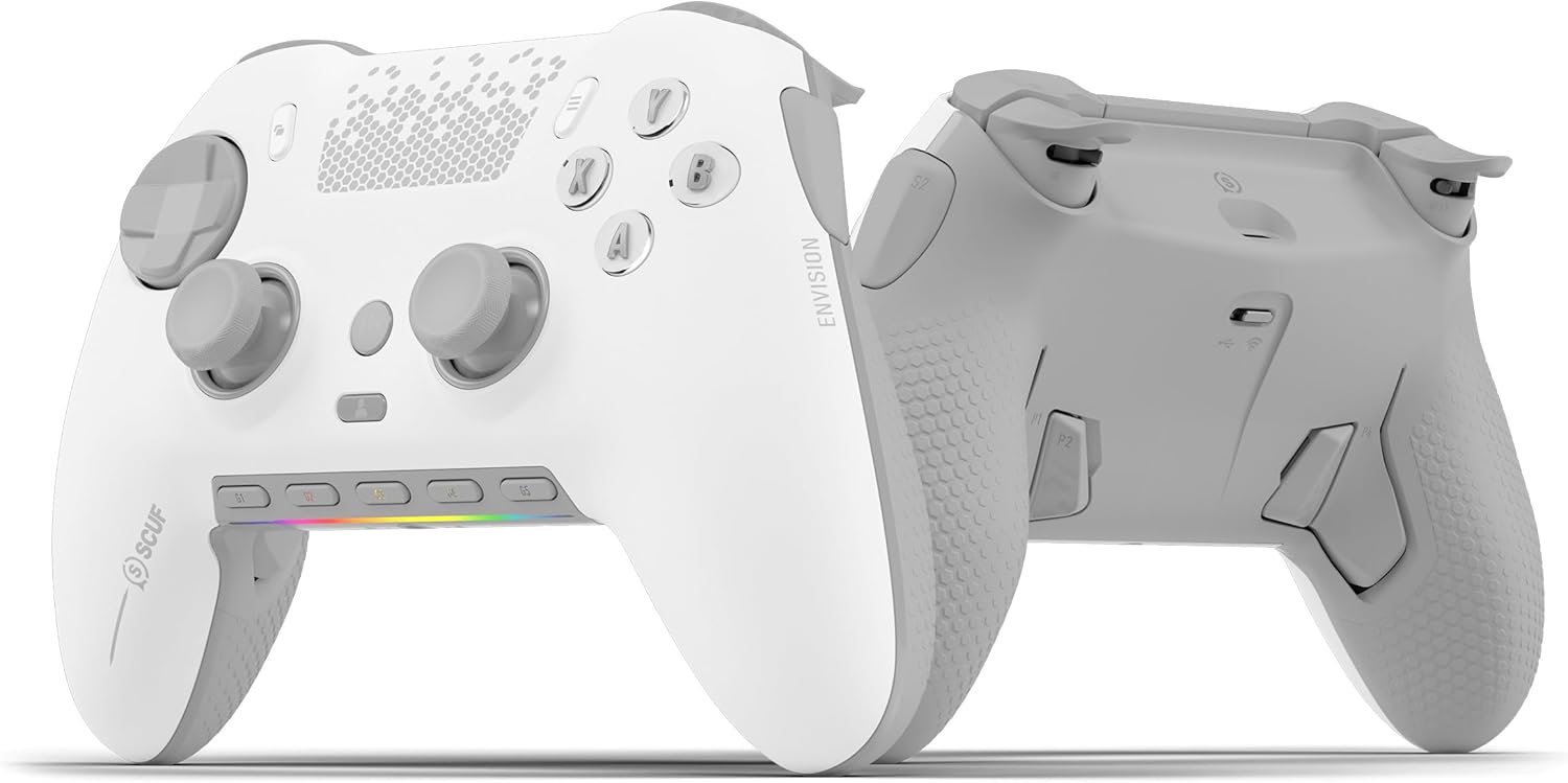 Безжичен геймърски контролер SCUF ENVISION PRO - Пет подвижни G-бутона - Подвижни задни лостчета - Моментални тригери - Съвместим с iCUE - Бял