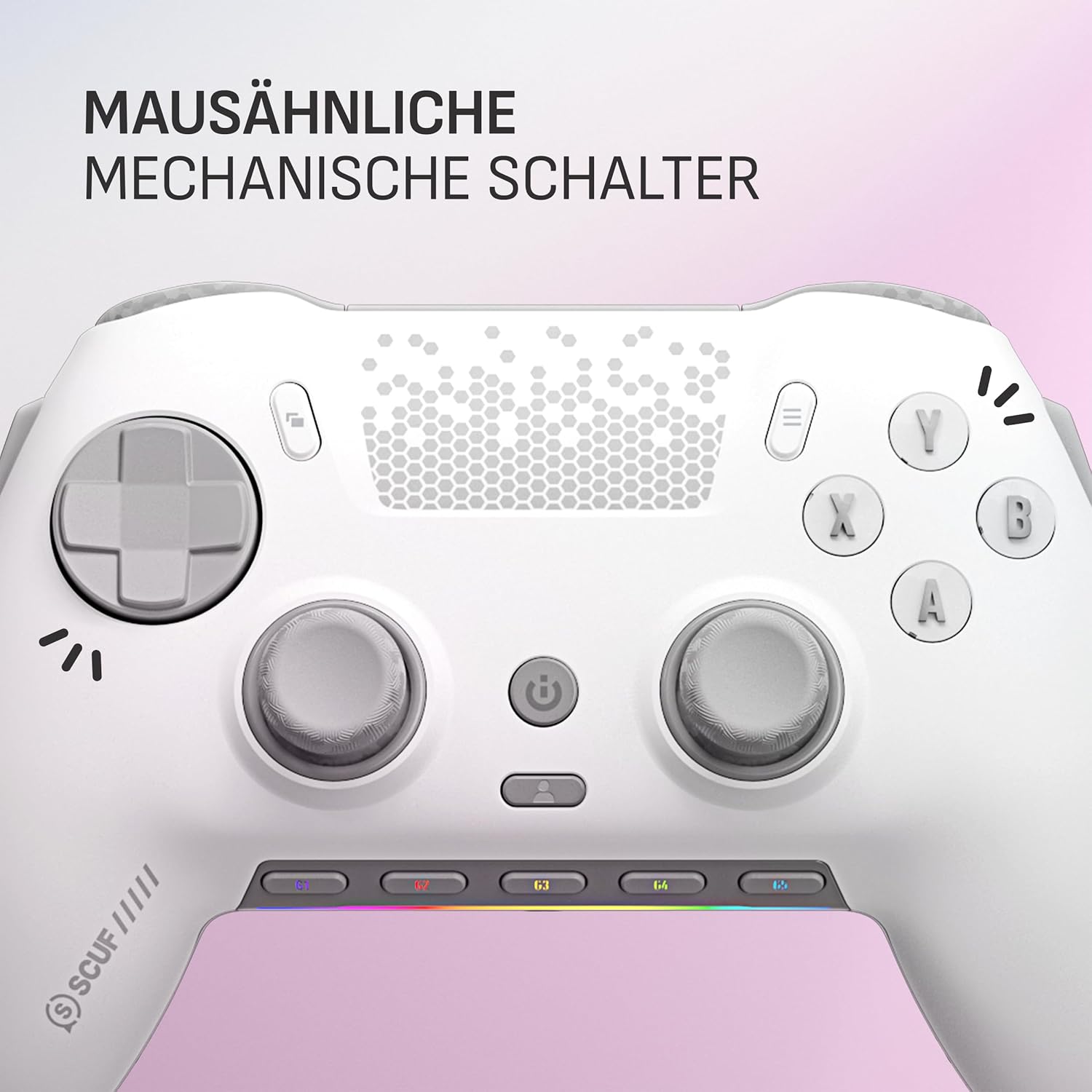 Безжичен геймърски контролер Scuf ENVISION PRO само за компютър - Щифтове за палеца против отклонение - Пет G бутона за многократна употреба - Многократни задни лостчета - Незабавно задействане - Бял