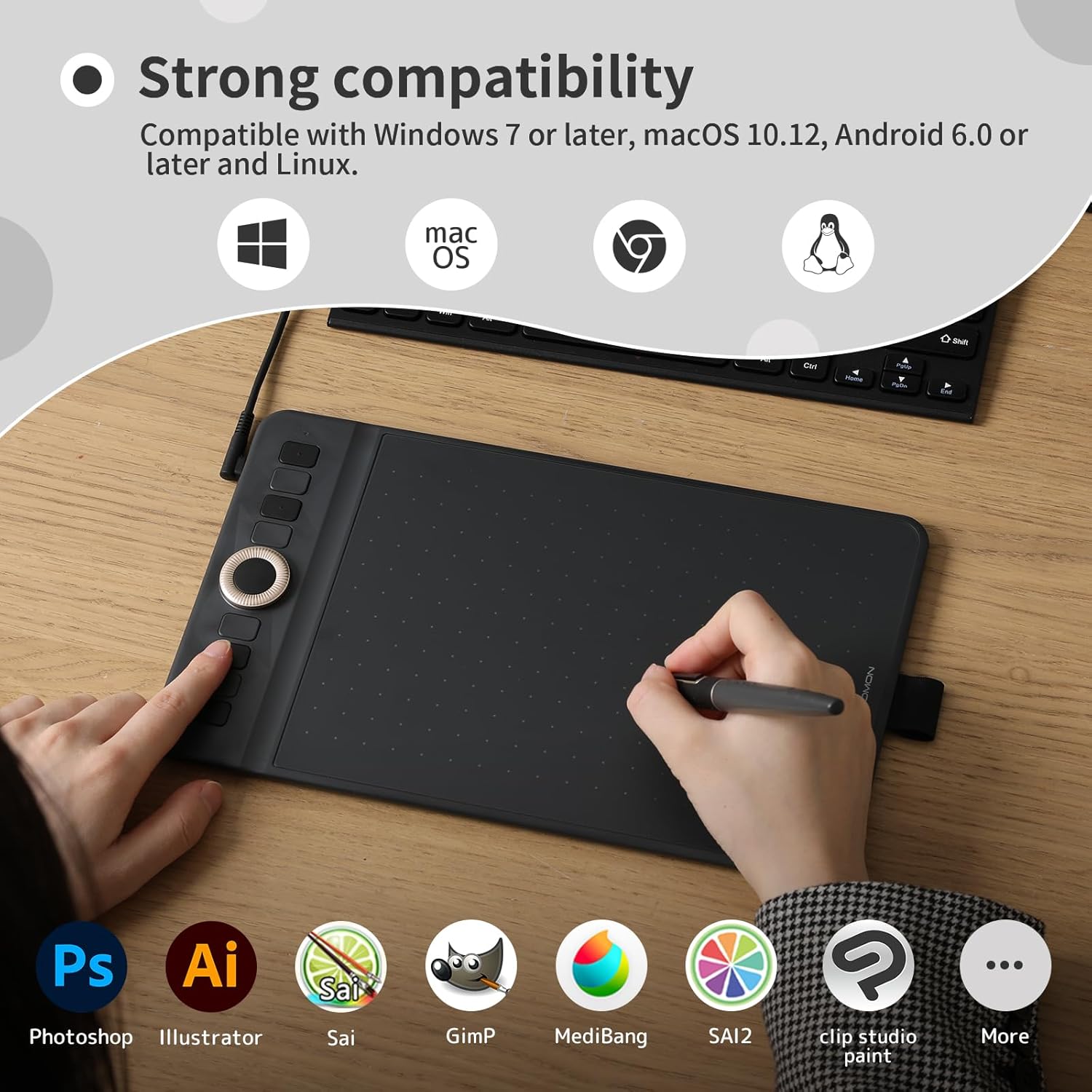 • Съвместимост и приложение: Графичният таблет GAOMON е съвместим с Linux, Chrome, Android, Windows 7 и Mac 10.12 или по-нова версия. Дигиталната дъска за рисуване GAOMONS620 работи с повечето програми като Adobe Photoshop, Illustrator, Clip Studio, Lightroom, Sketchbook Pro, Corel Painter, OpenCanvas, Paint Tool Sai2, Krita и други. Работи с Android устройства: Работи с Android устройства с версия 6.0 или по-нова, които поддържат OTG функционалност.