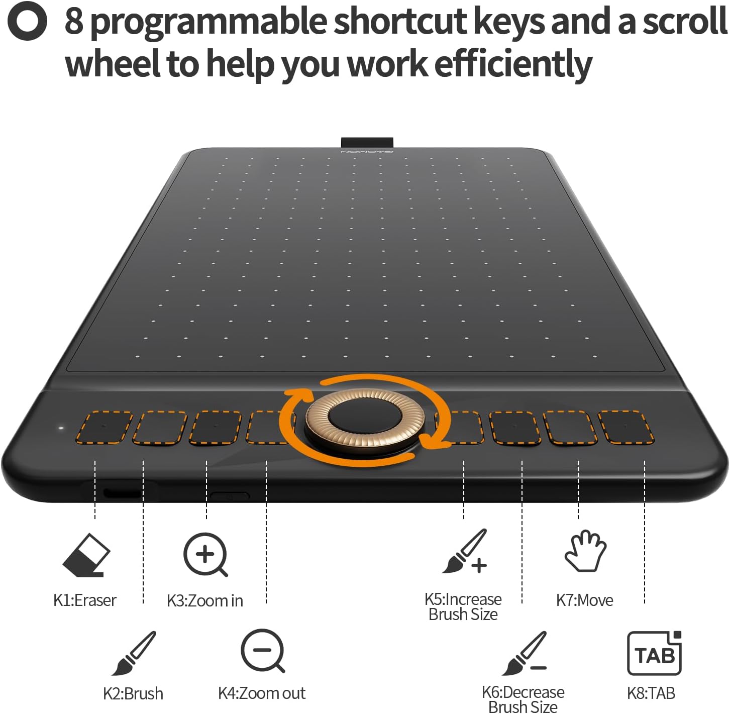 • 【AP32 съвместим стилус】Стилусът без батерии елиминира неудобството от зареждането на писалката. 【8192 нива на натиск и 4 персонализируеми експресни клавиша】Той предлага прецизен контрол и точност на върха на пръстите ви, което ви позволява да рисувате по-естествени линии и да подобрите творческия си резултат. 4-те персонализируеми клавиша могат да бъдат конфигурирани да изпълняват повече функции, както желаете. Използването им по време на работа значително ще подобри работния ви процес.