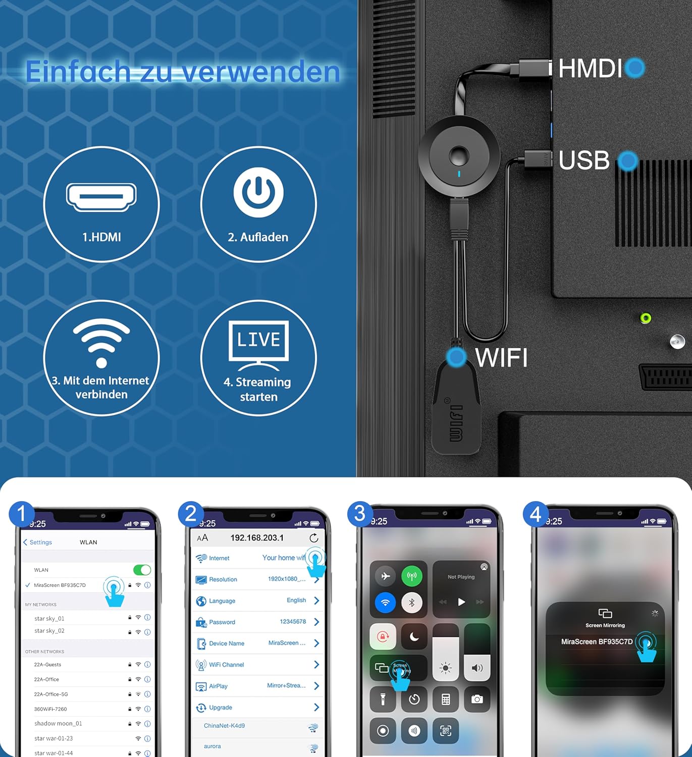 • AT-Mizhi HD предаване на екрана без кабел: 1080P HD изображение, 2.4GHz WiFi модул, Mira-cast адаптер, могат да постигнат прекрасен HD скрийкастинг. И да гледат интересно съдържание като видеоклипове/снимки/PPT и др., без да е необходимо да споделят дълъг и цапащ кабел със семейството и приятелите си.