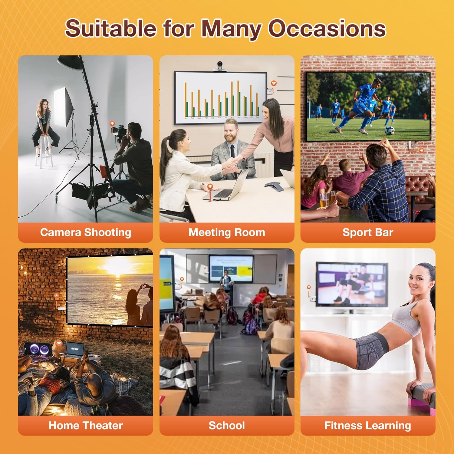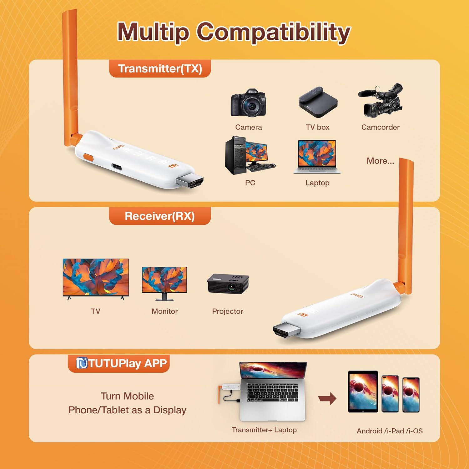 • Приложим за множество устройства и сценарии: Безжичният HDMI адаптер TIMBOOTECH поддържа предаване на сигнал от лаптоп, компютър, камера, цифрова приставка и кабелна/сателитна приставка, Blu-ray плейър, DVD, DSLR и други HDMI изходни устройства към множество проектори, HDTV и монитори. Подходящ за дома, магазина, киното на открито, бара, залата на живо, студиото, училището, клиниката, църквата, сватбата и други места.
