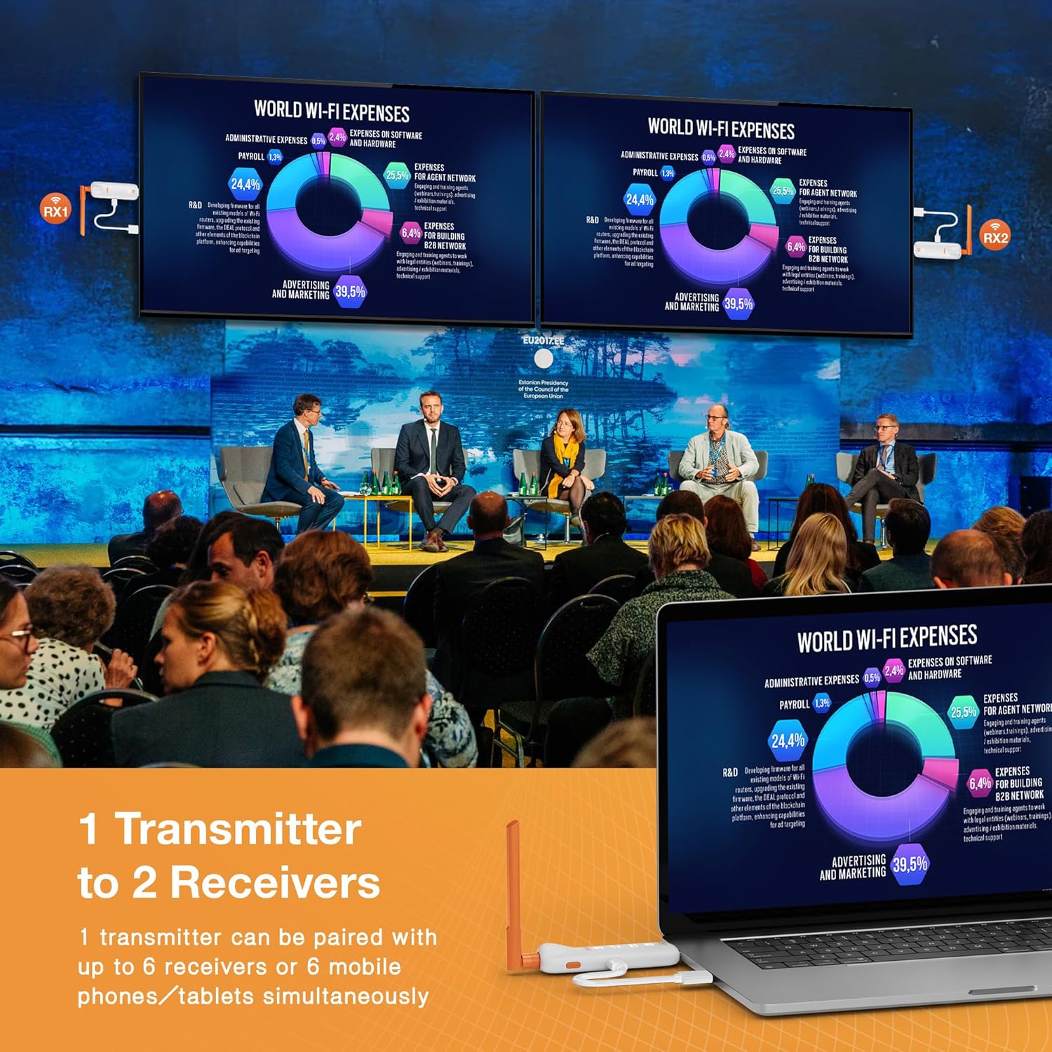 Безжичен HDMI предавател и 2 приемника - до 6 RX-а, безжичен предавател 2 приемника 5G, HDMI радио предаване 4K декодиране на видео от лаптоп/TV приемник/камера към мулти телевизори/проектори/монитори 165 фута (54 метра)