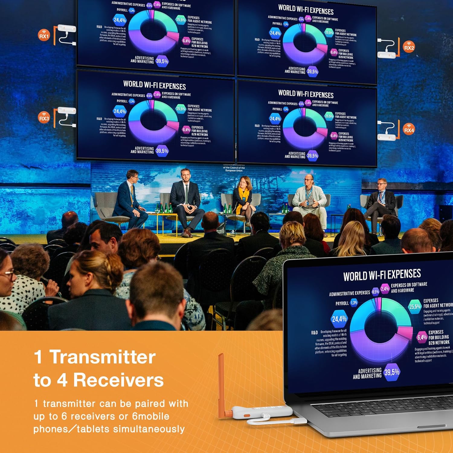 Безжичен HDMI предавател и 4 приемника - до 6 RX-а, TIMBOOTECH Безжичен предавател 4 приемника 5G UHD, HDMI радио предаване на видео и аудио от лаптоп/телевизор/камера към мулти телевизори/проектор