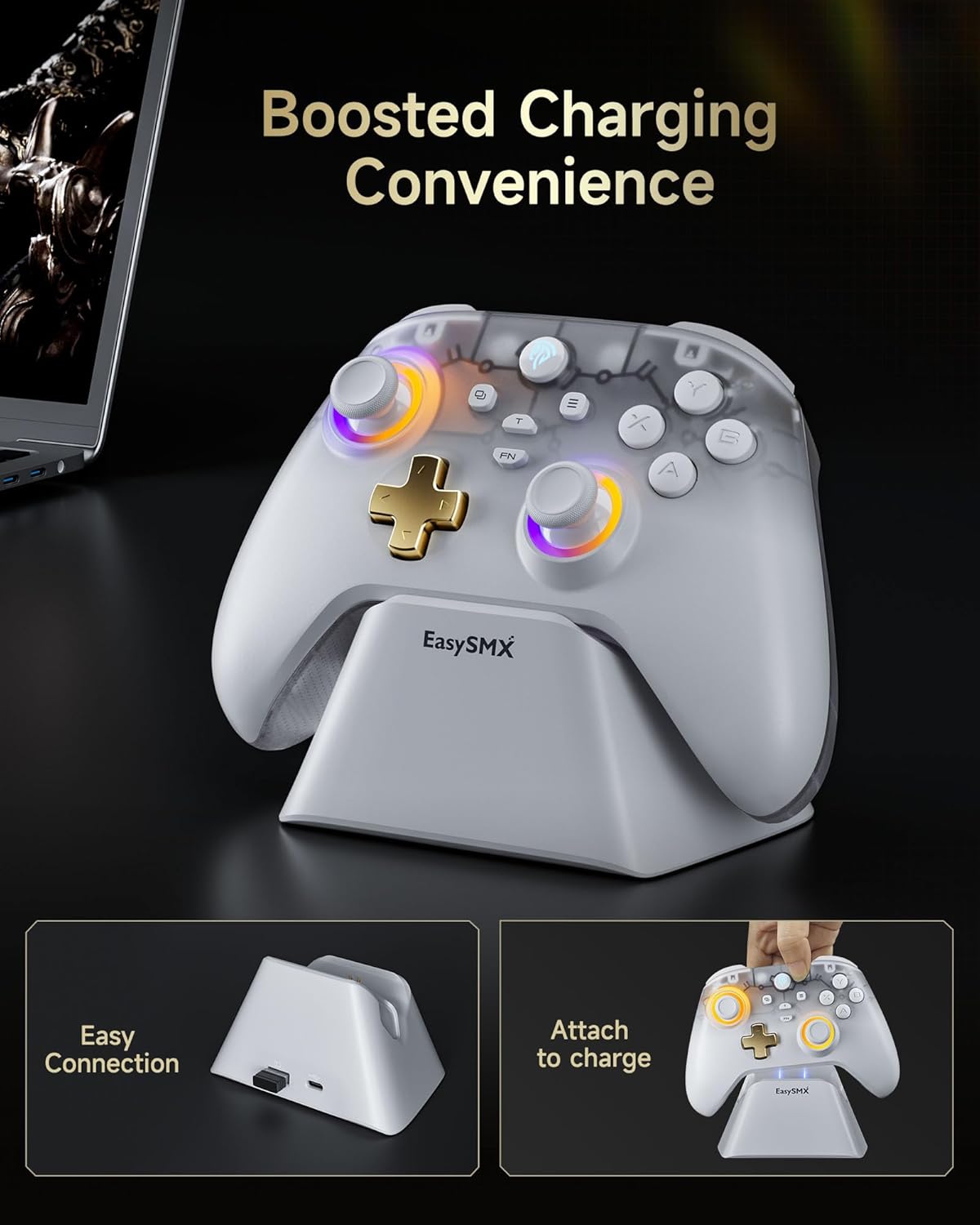 Безжичен компютърен контролер EasySMX D05 със станция за зареждане, джойстик за Хол и спусък за Хол, Bluetooth джойстик за компютър/Switch/мобилен телефон, бял