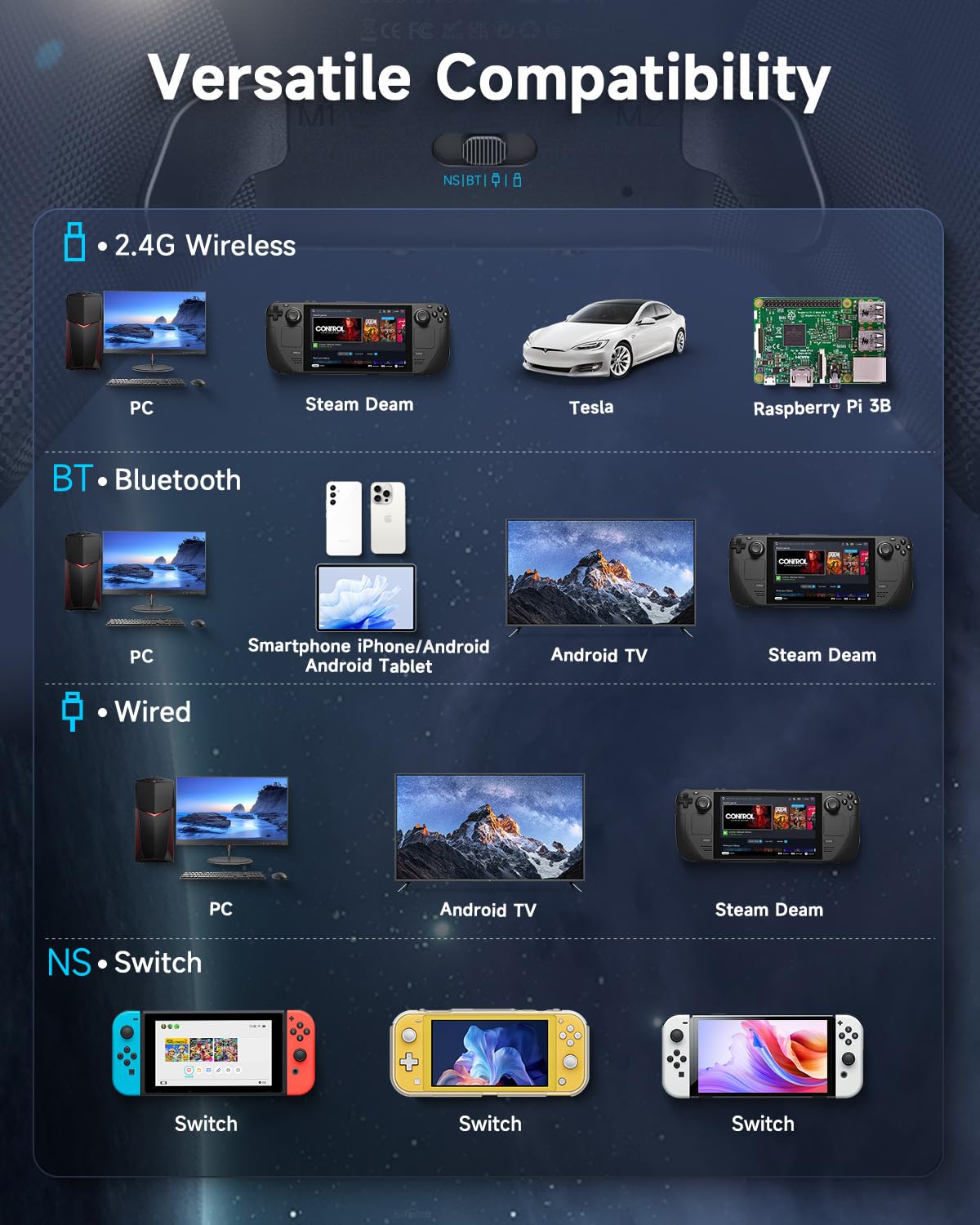 • 【Широка съвместимост】Контролерът за компютър е проектиран за различни платформи, включително PC, Switch, iOS и Android. Можете да свържете контролера безжично чрез Bluetooth.