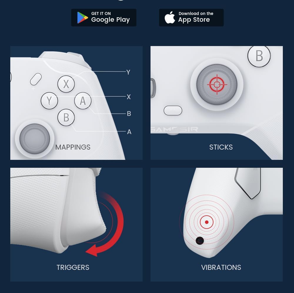 • 2 различни вибриращи мотора в дръжките осигуряват силни и фини вибрации. 2 мотора в спусъците осигуряват обратна връзка директно на върха на пръстите ви. Вибрацията на спусъка се поддържа само в режим Bluetooth XInput.