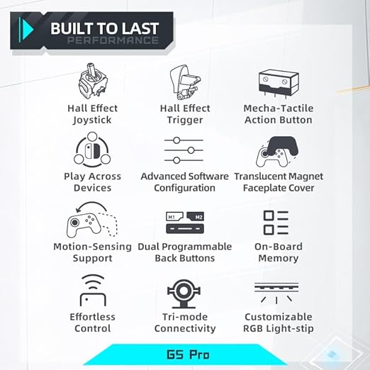 • Трирежимна свързаност: безжичният контролер G5 Pro за компютър поддържа както кабелна (чрез 2 м USB 2.0 кабел), така и безжична (2.4 GHz и Bluetooth) свързаност и се захранва от литиево-йонна батерия с капацитет 600 mAh, която осигурява до 8 часа непрекъснато възпроизвеждане.