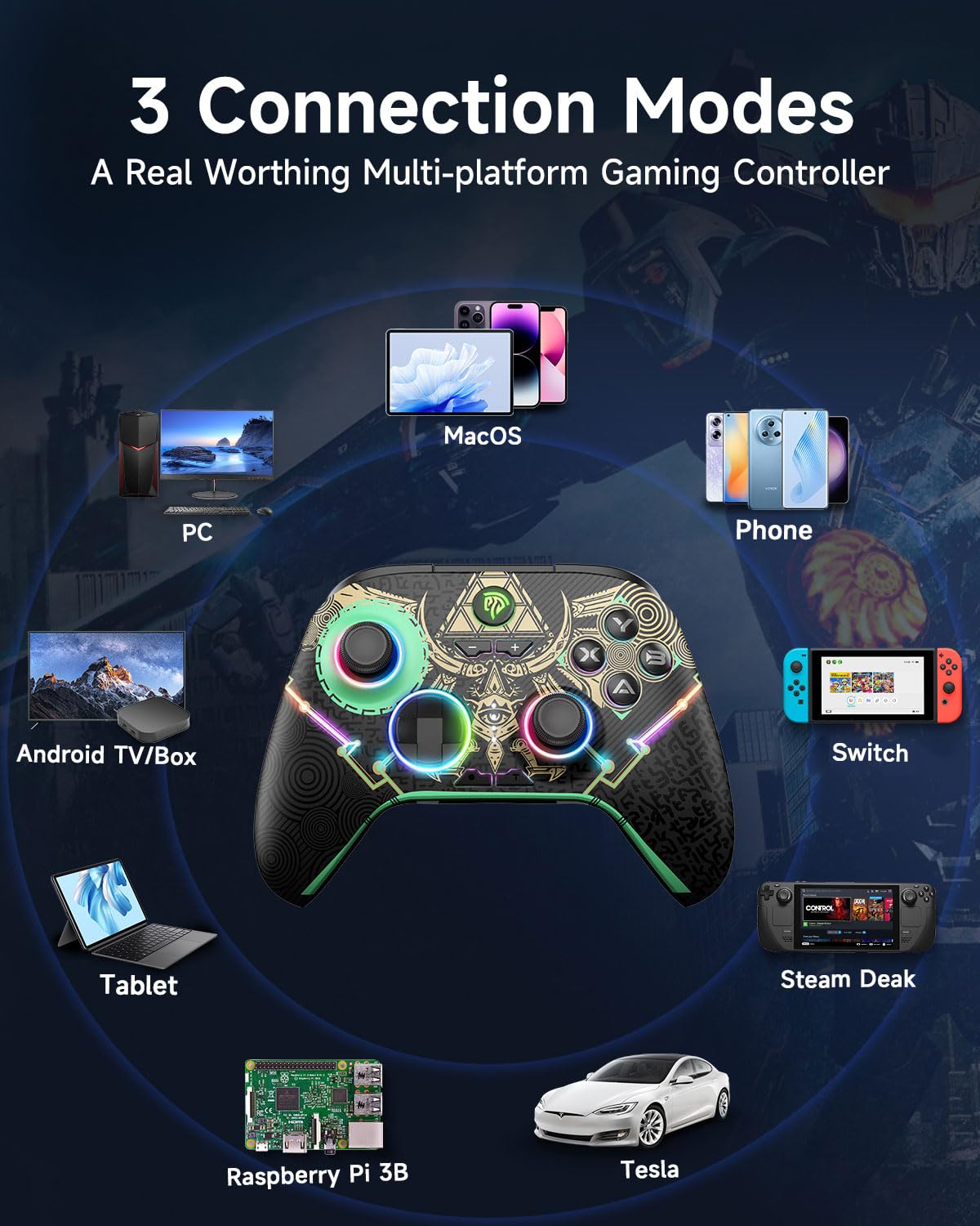• Bluetooth / 2.4G / кабел: безжичният контролер за компютър има 3 метода за свързване: 2.4G USB приемник (PC) и Bluetooth (Switch, Android, iOS и таблет). Ако промените метода на свързване, трябва да превключите в съответния режим.