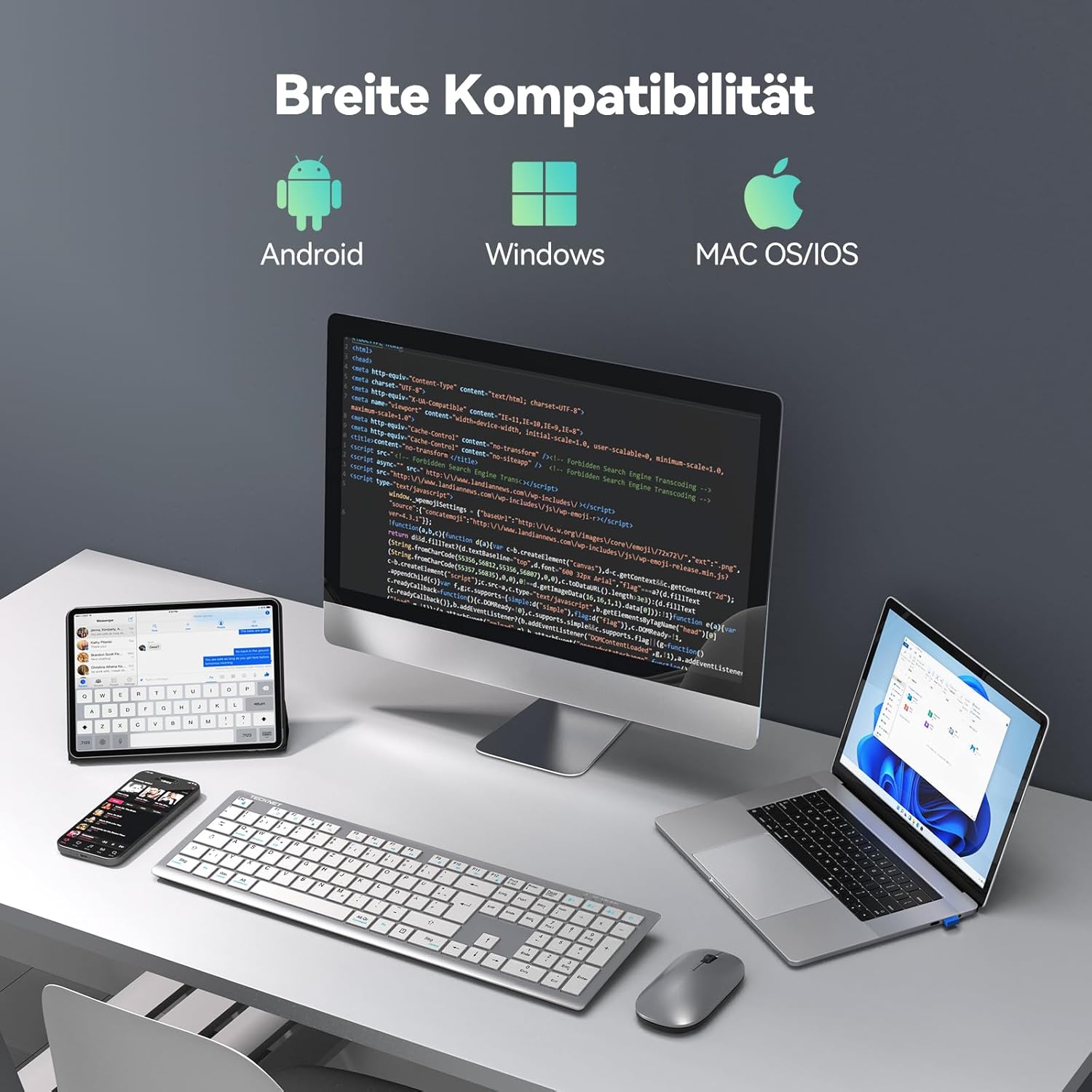 • ШИРОКА СЪВМЕСТИМОСТ: Пълноразмерната Bluetooth клавиатура TECKNET с цифров блок е съвместима с Windows, iOS, macOS и Android, което я прави идеална за широк спектър от устройства, включително iPad, таблети, смартфони, лаптопи, настолни компютри и смарт телевизори. За устройства без Bluetooth, просто използвайте включения USB приемник за стабилна връзка.