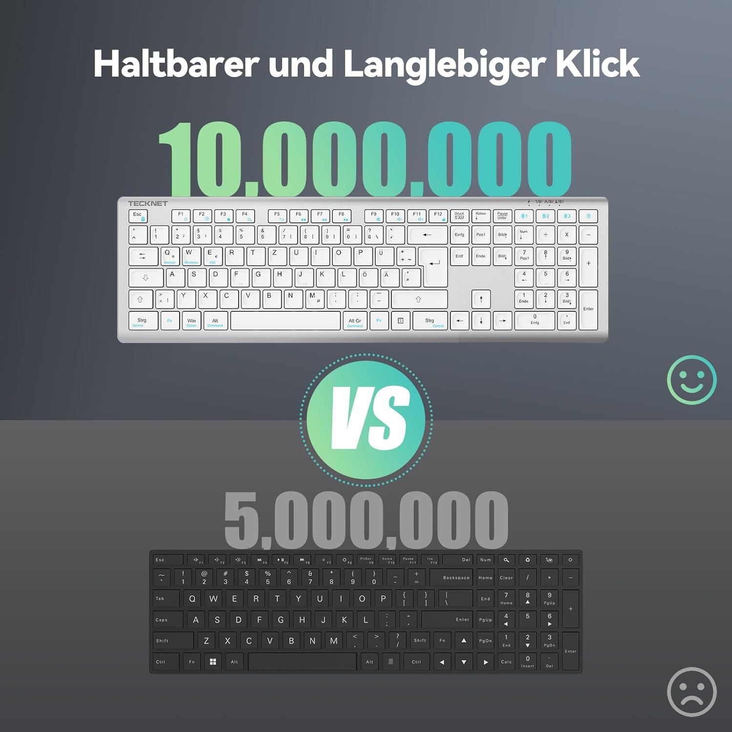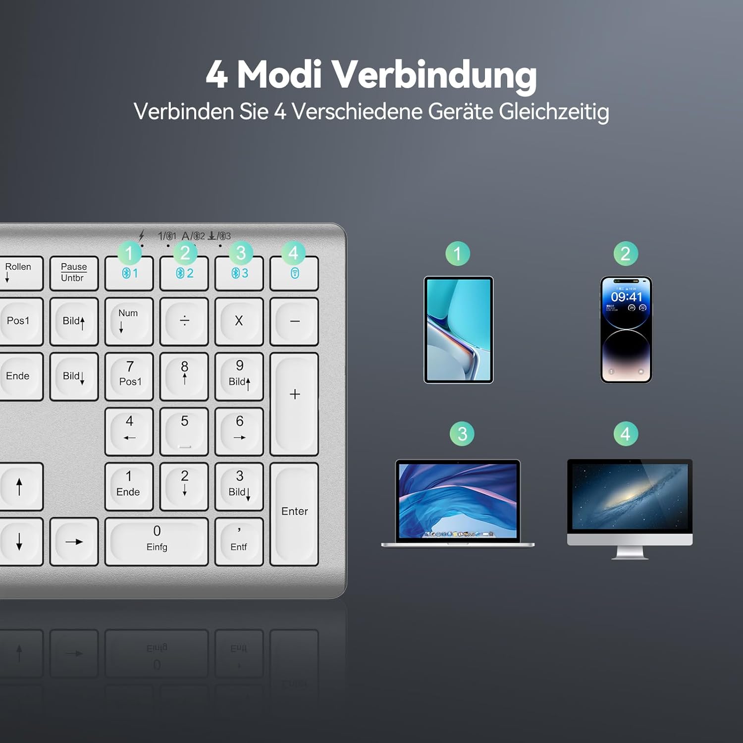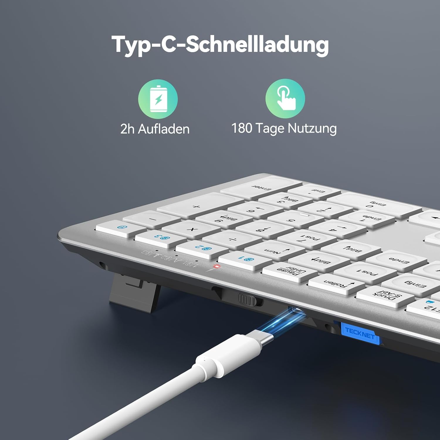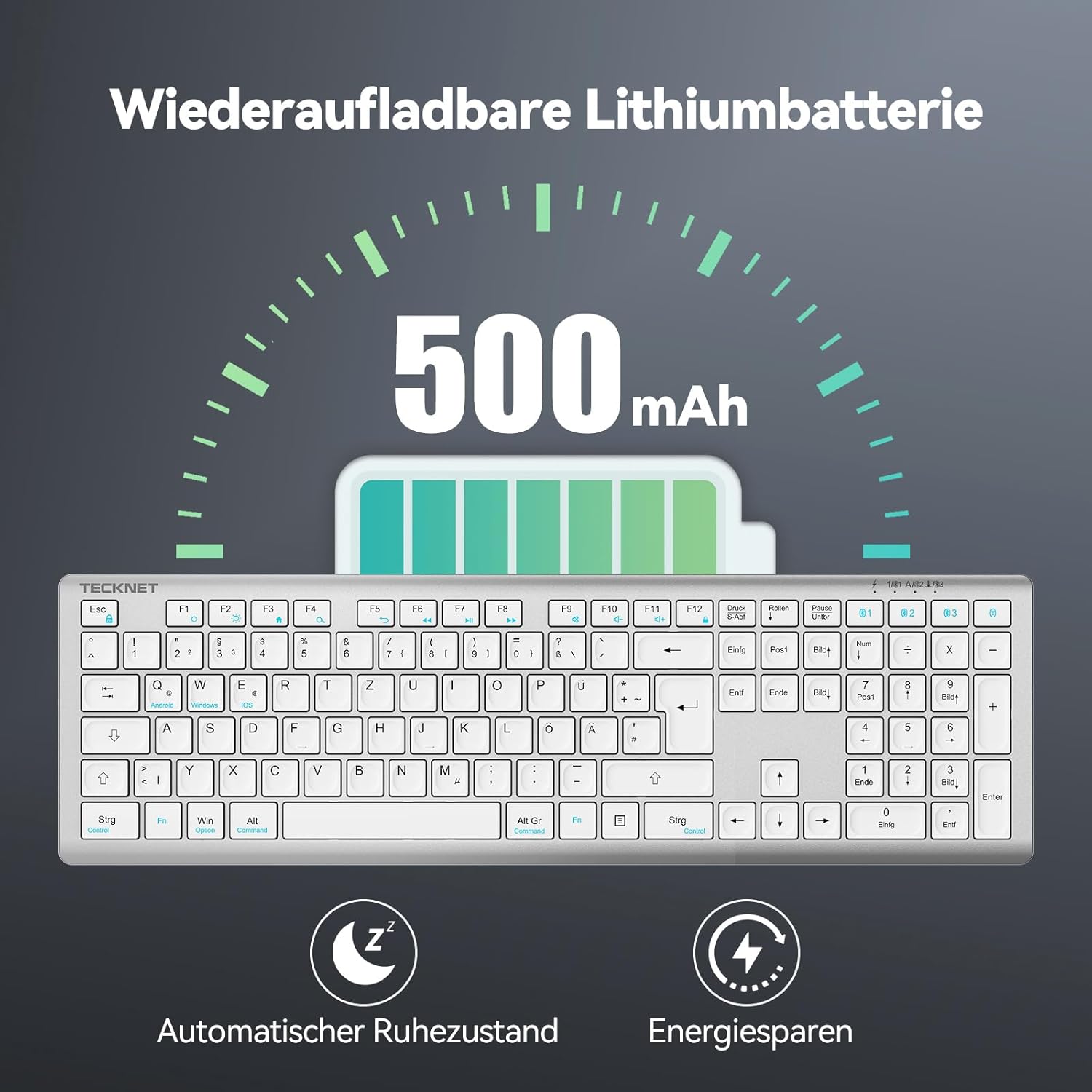 Безжична Bluetooth клавиатура TECKNET, презареждаща се безжична клавиатура за множество устройства с лесна работа до 4 устройства, ултра тънка, немска подредба (QWERTZ), за Mac, Windows, iOS