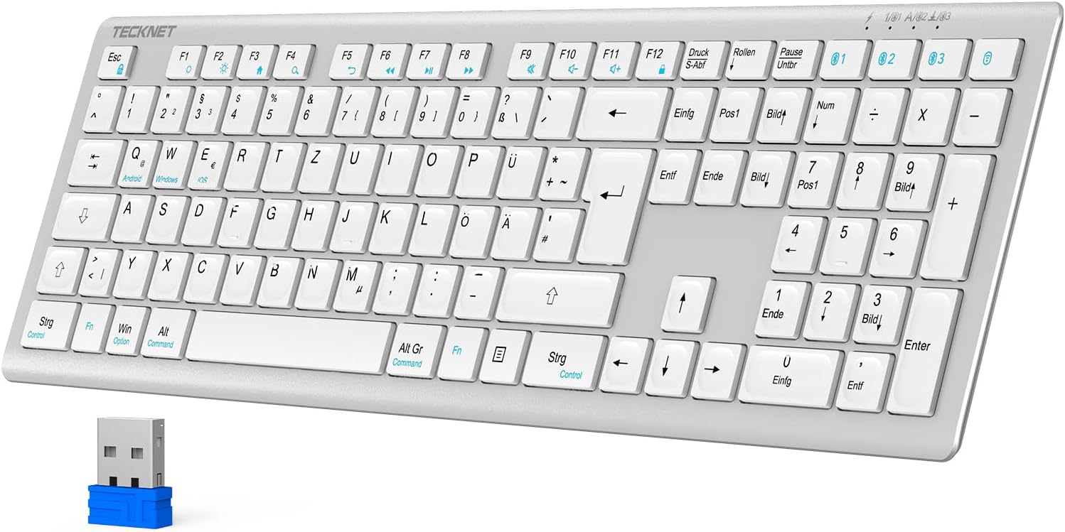 Безжична Bluetooth клавиатура TECKNET, презареждаща се безжична клавиатура за множество устройства с лесно свързване за до 4 устройства, ултратънка, немска подредба (QWERTZ), за Mac, Windows, iOS, Chrome OS