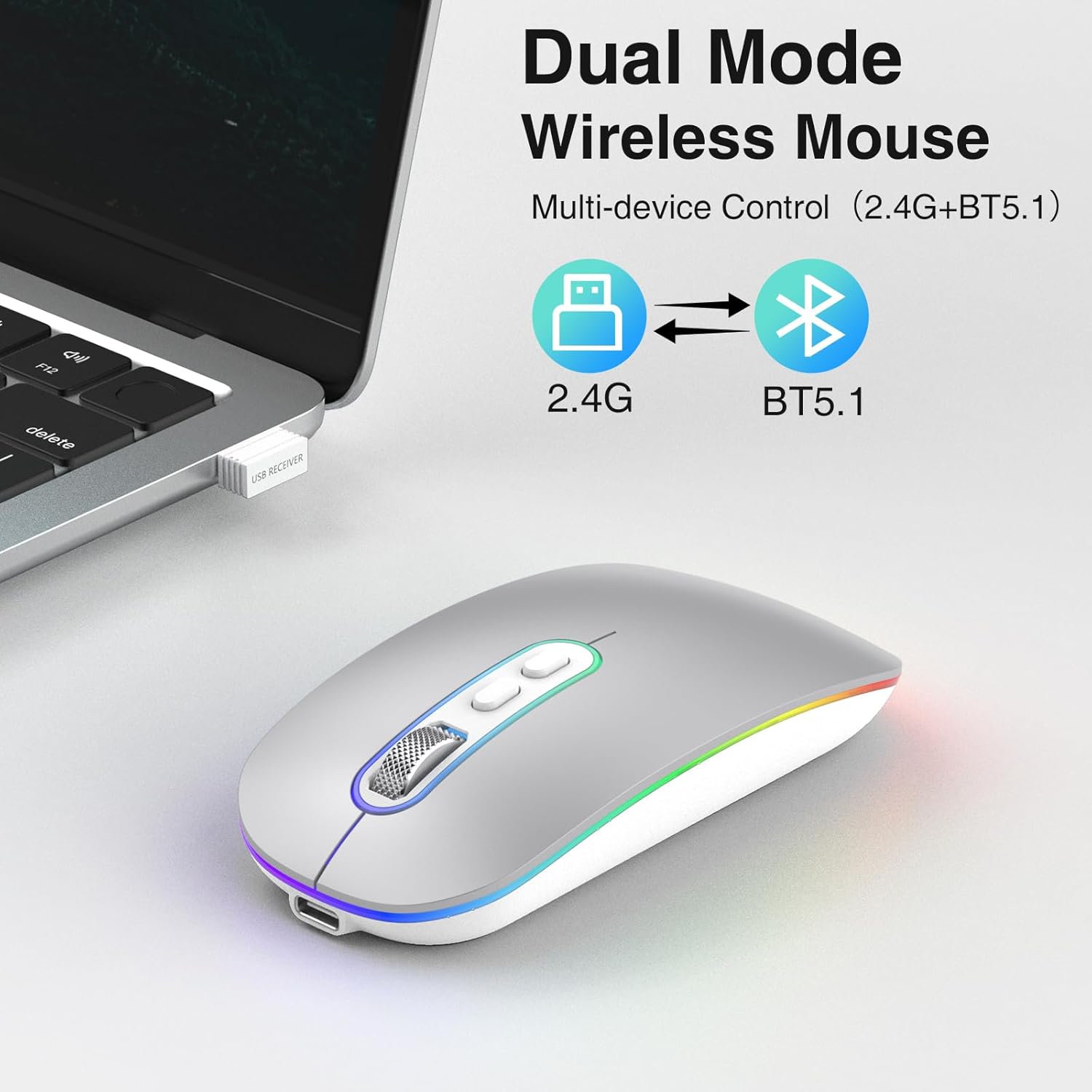 Безжична Bluetooth мишка cimetech (Bluetooth 5.1 + USB 2.4 GHz) LED с двоен режим, презареждаща се оптична офис безжична мишка за лаптоп, MacBook Air Pro, iPad, компютър, настолен компютър, мишка с USB C адаптер