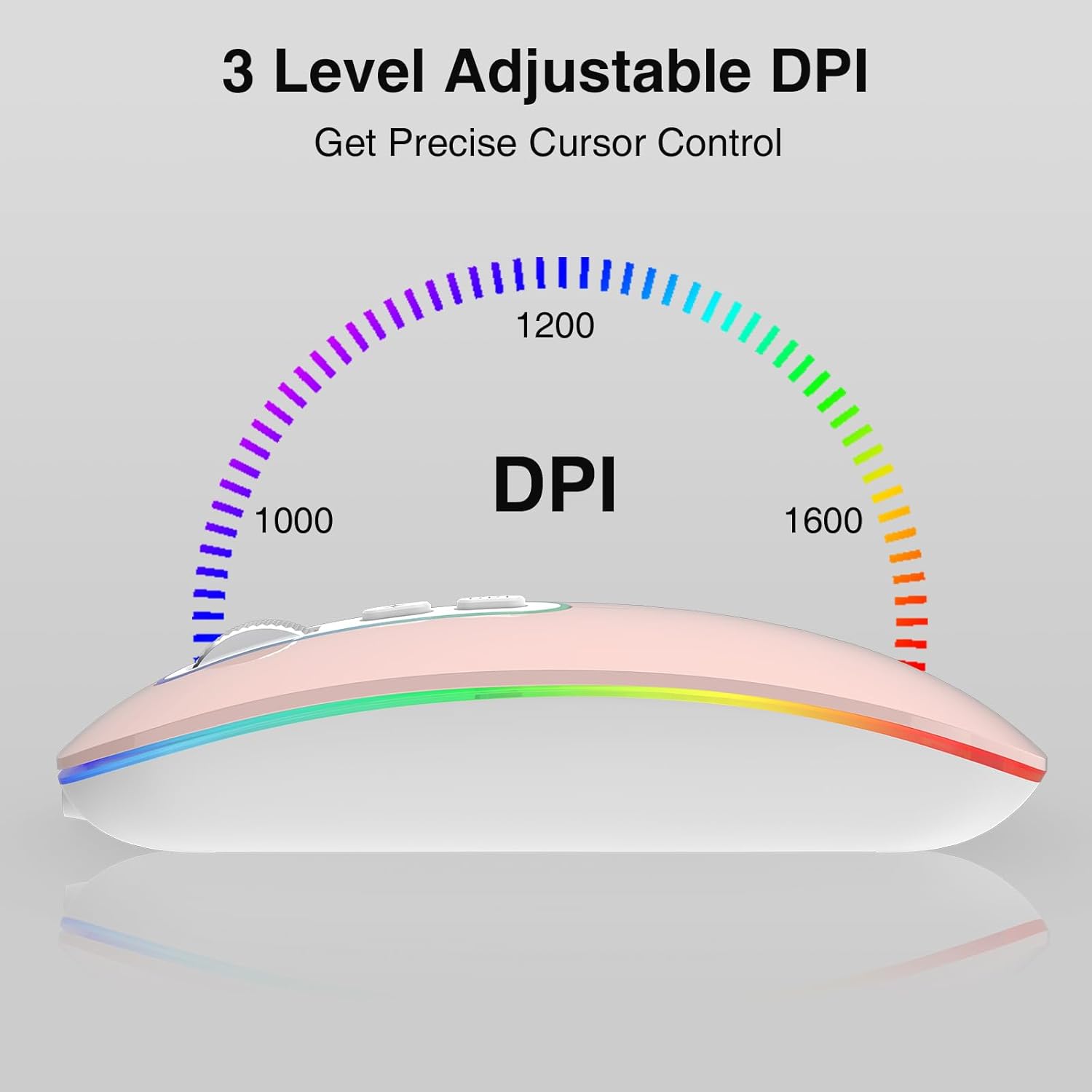 • Подобрен LED дизайн: безжичната Bluetooth мишка се осветява с 5 различни цвята, които се променят произволно по време на употреба, осигурявайки успокояващи светлинни ефекти и създавайки хладна и изискана атмосфера за работа и забавление. Изключвайте LED светлината на мишката, когато не я използвате, за да пестите енергия. С 3 регулируеми нива на DPI можете да контролирате скоростта на мишката за пътуване.
