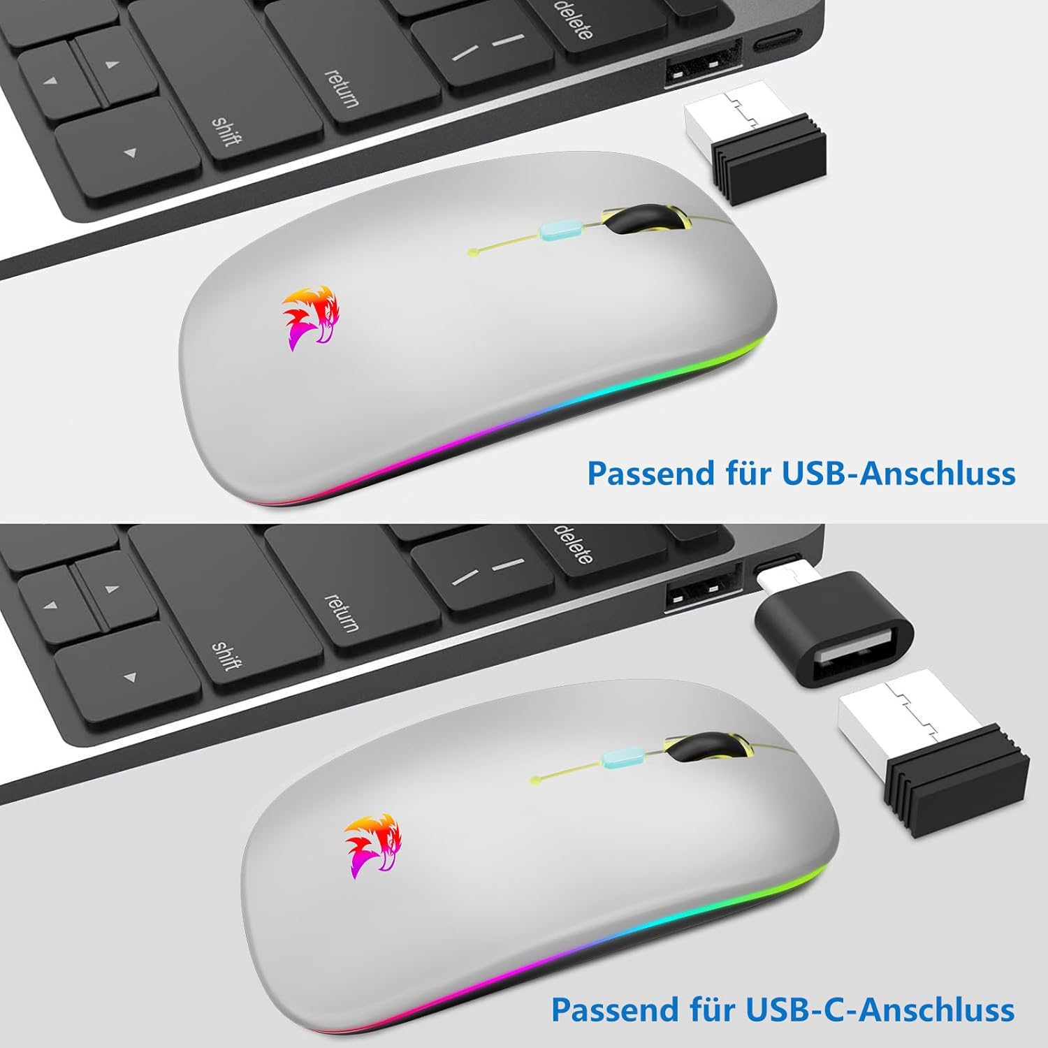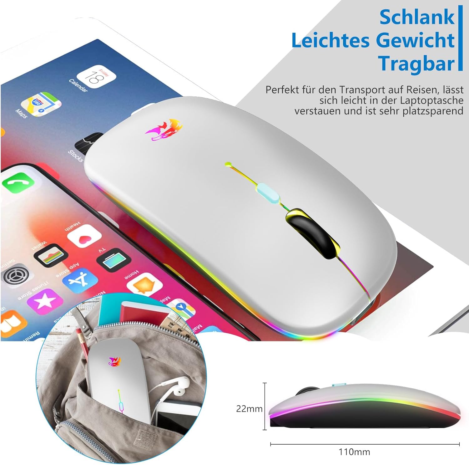 • Широка съвместимост: Безжичната мишка 2.4GHz за лаптопи е подходяща за лаптопи, настолни компютри и всички устройства с USB порт. Просто свържете USB приемника и го включете. Bluetooth мишката е съвместима с лаптопи, Mac, PC, iPad, iPhone и други устройства с Bluetooth. Забележка: Системни изисквания за BT5.1: Windows 8.0, Windows 10 или по-нова версия; MacOSX 10.10 или по-нова версия; Приложимо с iOS13 или по-нова версия/Android 5.0 или по-нова версия. Проверете или актуализирайте операционната система преди употреба.