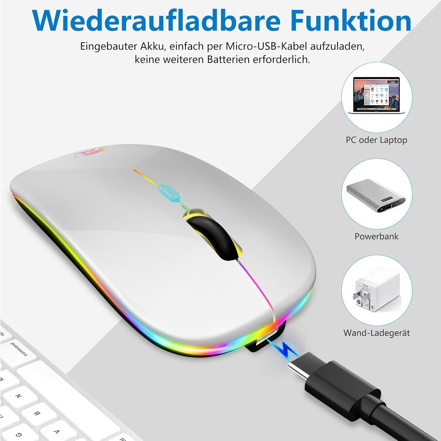 • Вградена батерия и автоматично пестене на енергия: безжичната мишка има вградена батерия (500 mAh) и се предлага с кабел за зареждане, който може да се зарежда през USB порта. Времето за зареждане е само 2-3 часа и поддържа 30 дни в режим на готовност. Ако не използвате мишката в продължение на 5 минути, тя автоматично преминава в режим на заспиване, за да пести енергия от батерията. Просто щракнете с мишката, за да се върнете в работен режим.