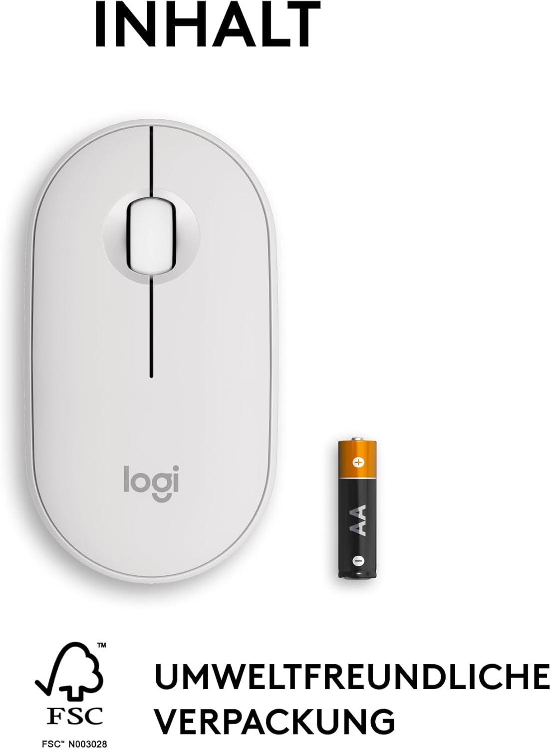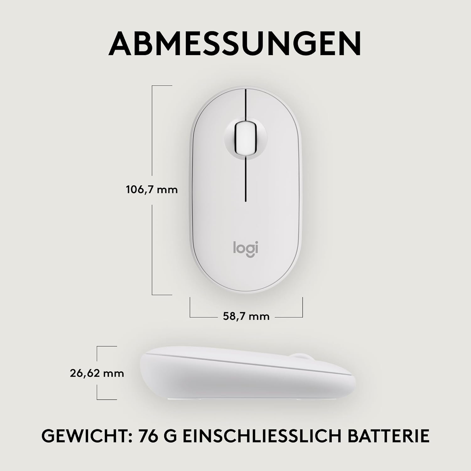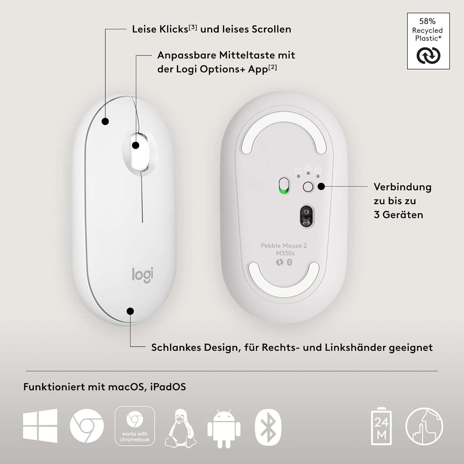 Безжична Bluetooth мишка Logitech Pebble Mouse 2 M350s Slim, преносима, лека, с персонализируеми бутони, тихи кликвания, лесно превключване за Windows, macOS, iPadOS, Android, ChromeOS – бяла