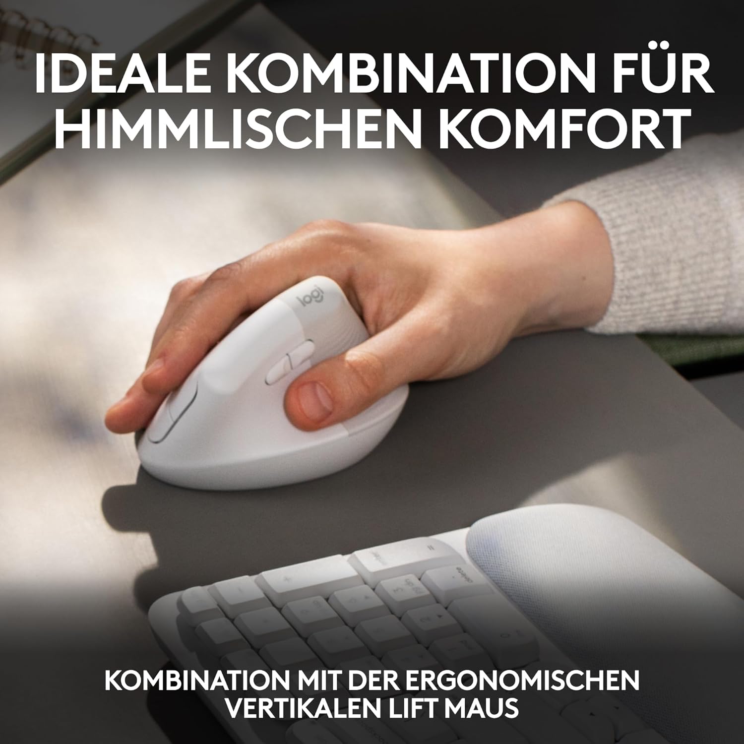 Безжична ергономична клавиатура Logitech Wave Keys, подплатена поставка за длани, удобно и естествено писане, Easy-Switch, Bluetooth, Logi Bolt, Multi-OS, Windows/Mac, немска QWERTZ подредба - бяла