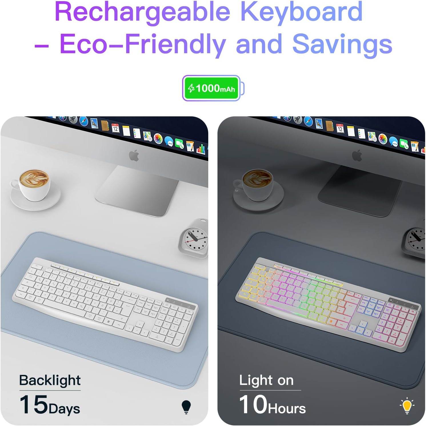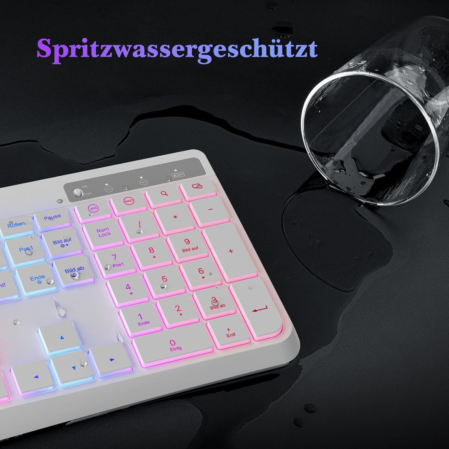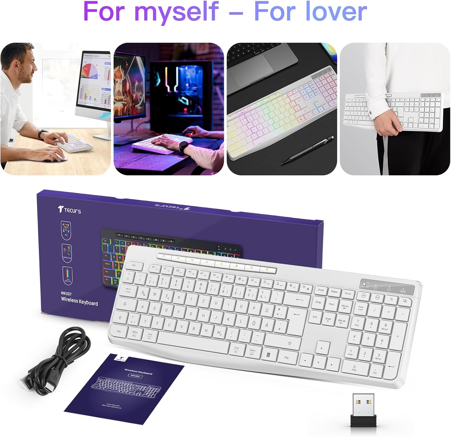 Безжична геймърска клавиатура TECURS, тиха QWERTZ ергономична водоустойчива 2.4GHz LED осветена клавиатура за Windows/Mac/PS4/Xbox с мултимедийни клавиши, бяла