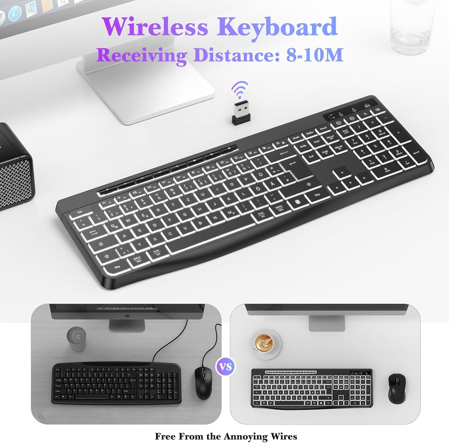 Безжична геймърска компютърна клавиатура TECURS, QWERTZ, бяла, осветена, ергономична, водоустойчива, 2.4 GHz LED, за Windows/Mac/PS4/Xbox с мултимедийни клавиши, черна