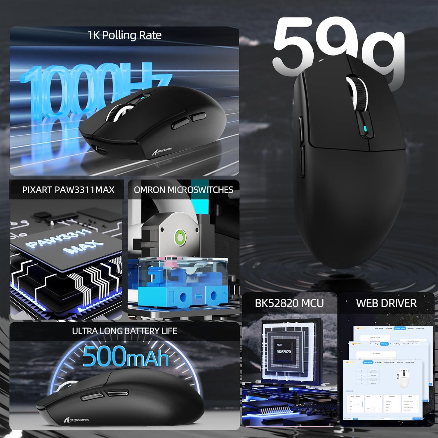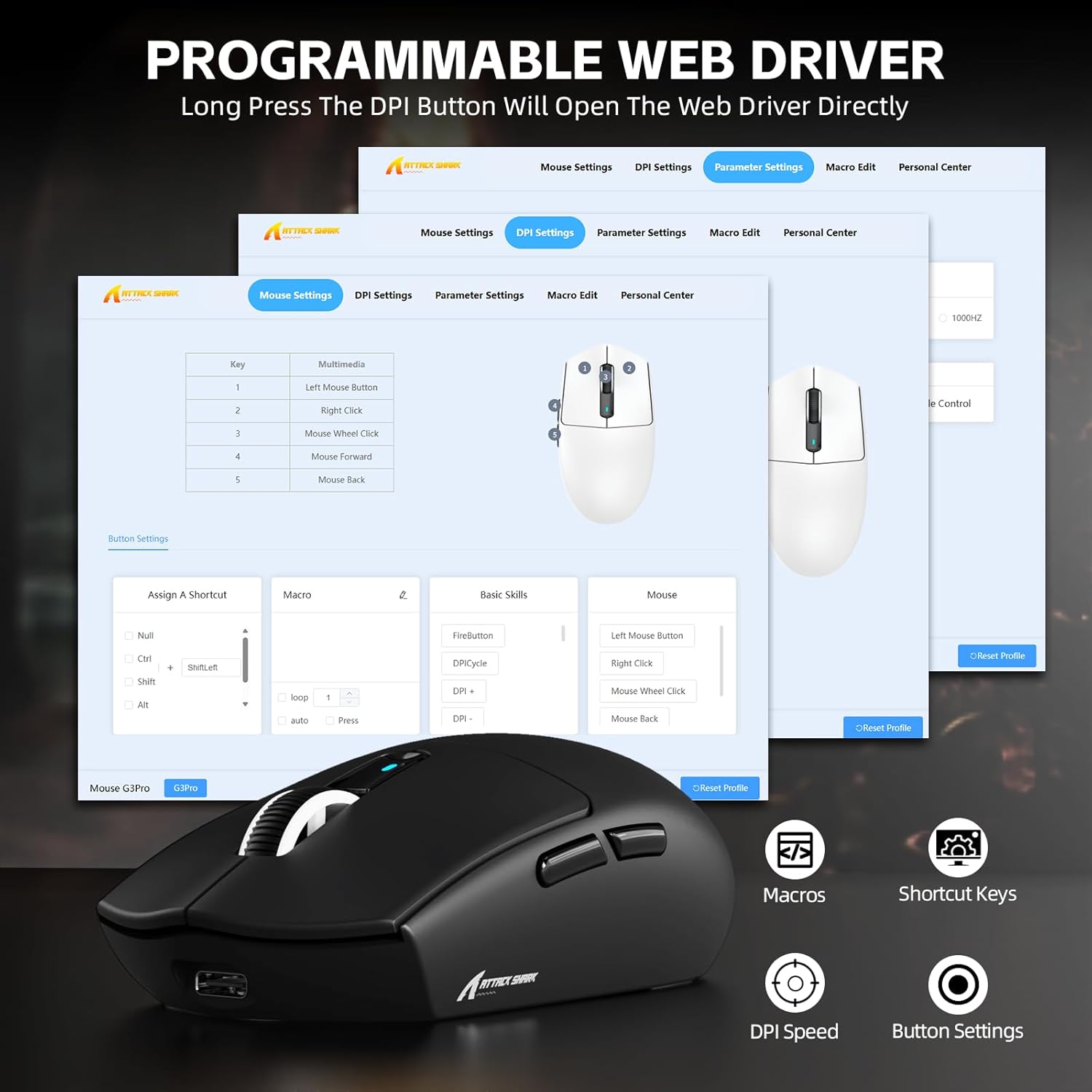 • Двоен драйвер: програмируемата мишка G3PRO има два драйвера: уеб драйвер (http://szslxd-tech.com/#/) и драйвер, разработен от самата ATTACK SHARK (изтегляне на драйвера: https://attackshark.com/pages/dirver-download). Конфигурирайте мишката си в драйвера, за да програмирате бутони, настройки на DPI, честота на заявките, макроси, LOD и други разширени функции. Можете безпроблемно да управлявате множество устройства и лесно да регулирате настройките на мишката.