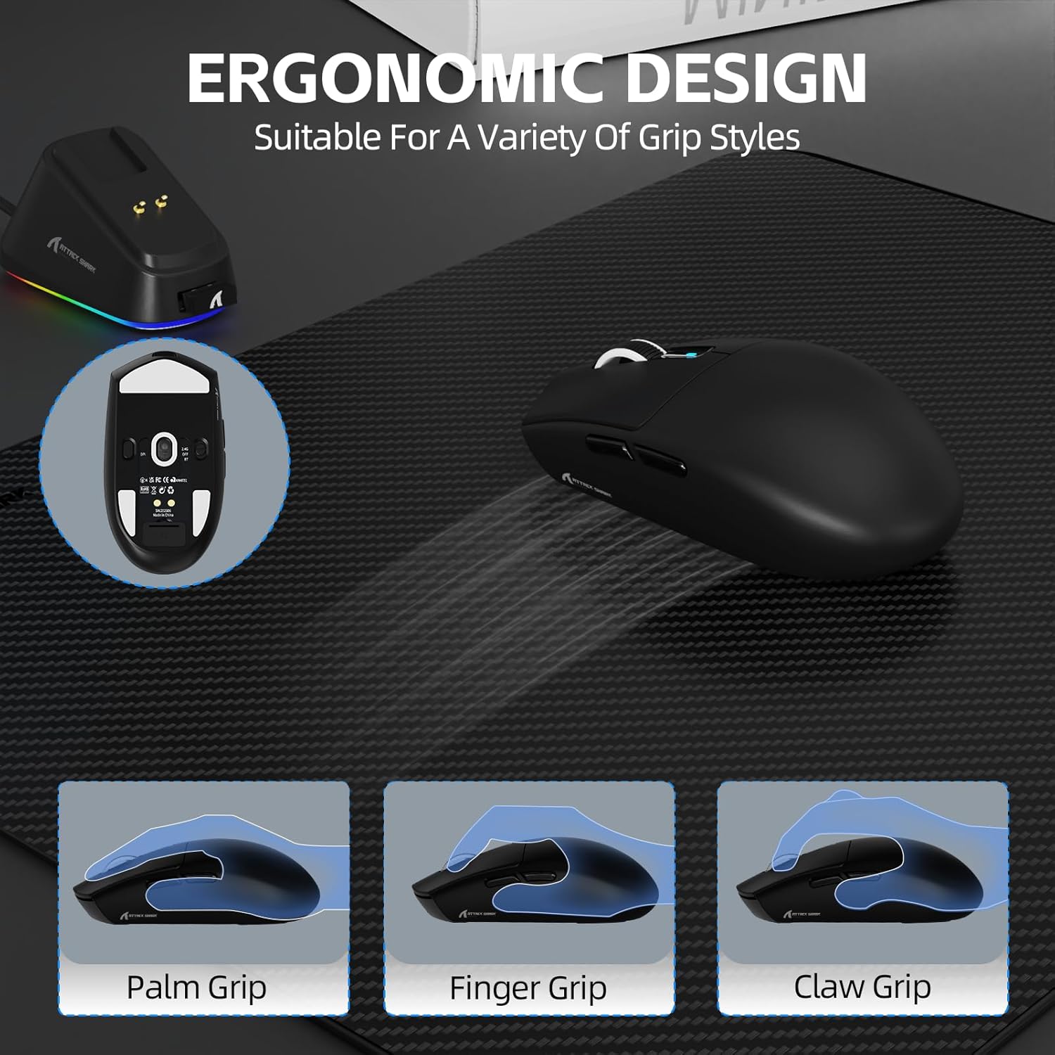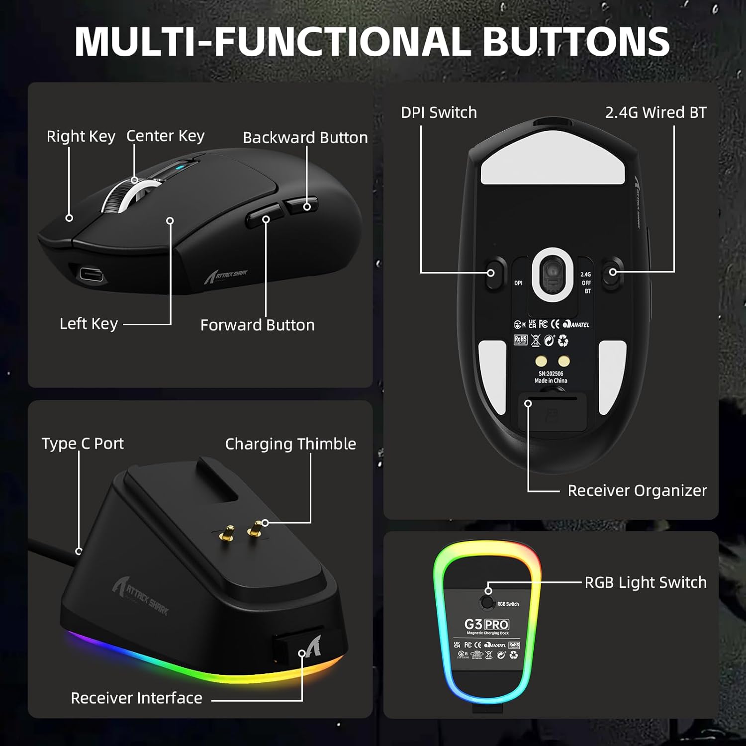 Безжична геймърска мишка ATTACK SHARK G3PRO с магнитна станция за зареждане, сензор PixArt PAW3311, до 25000 DPI, BT/2.4GHz/кабелна, 100 милиона кликвания, 59g супер лека мишка за PC/Xbox/PS/Mac - черна