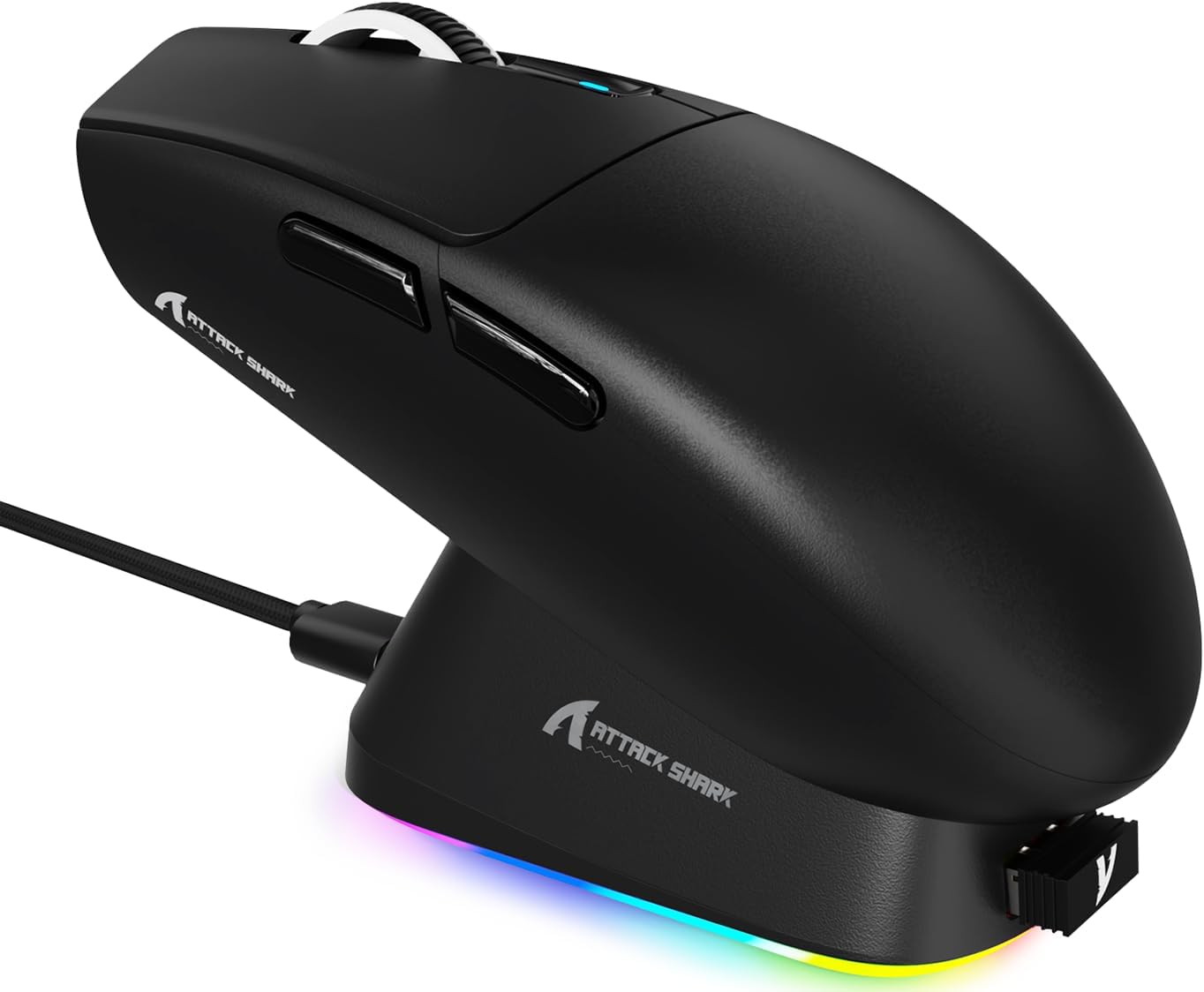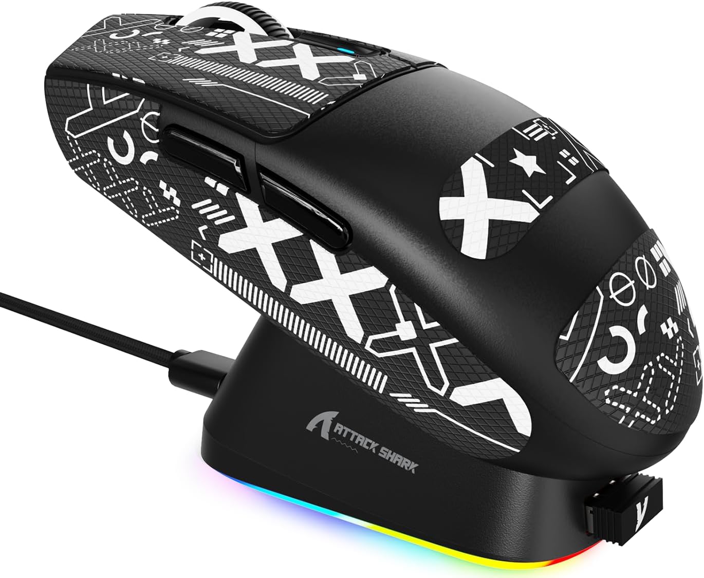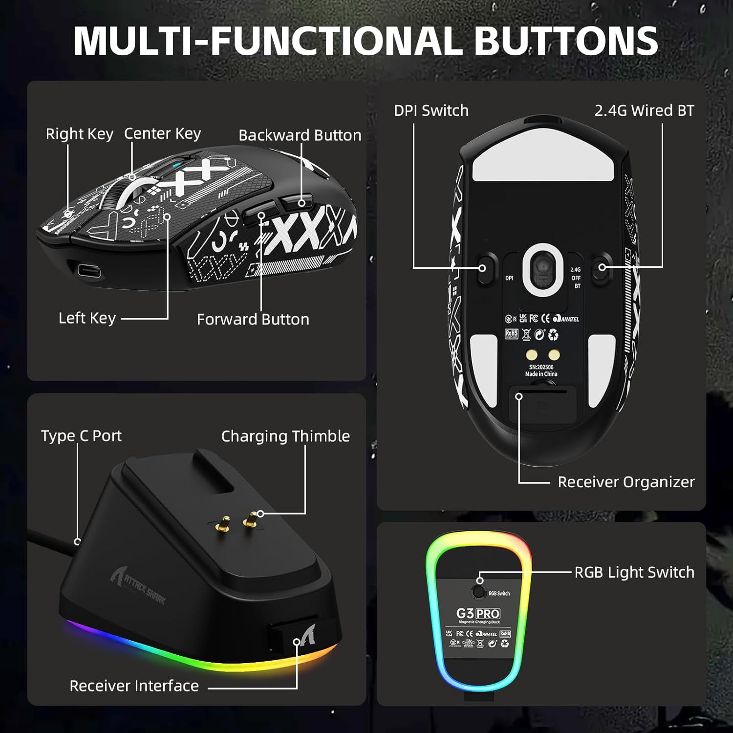 Безжична геймърска мишка ATTACK SHARK G3PRO с магнитна станция за зареждане, сензор PixArt PAW3311, до 25000DPI, BT/2.4GHz/кабелна, 59g супер лека мишка за PC/Xbox/PS/Mac - черна и с лента