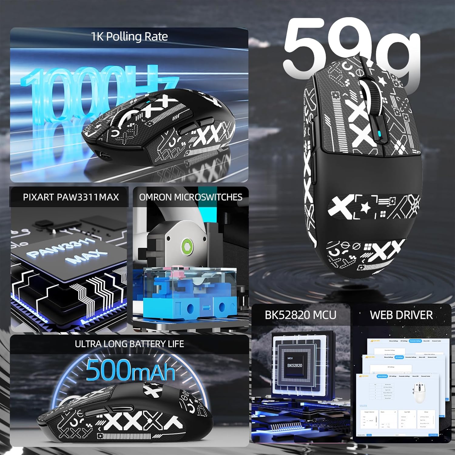 • Троен режим на работа на Broadcom BK52820: Безжичната геймърска мишка е оборудвана с мощния микроконтролер Broadcom BK52820. Трирежимна свързаност (2.4GHz безжична/USB-C кабелна/Bluetooth). Режимът 2.4GHz без забавяне осигурява светкавично бърза производителност, Bluetooth за безпроблемно сдвояване с повечето устройства. Играйте кабелно с ултра-гъвкавия кабел. Лесното превключване между режимите се осъществява чрез бутон в долната част на мишката.