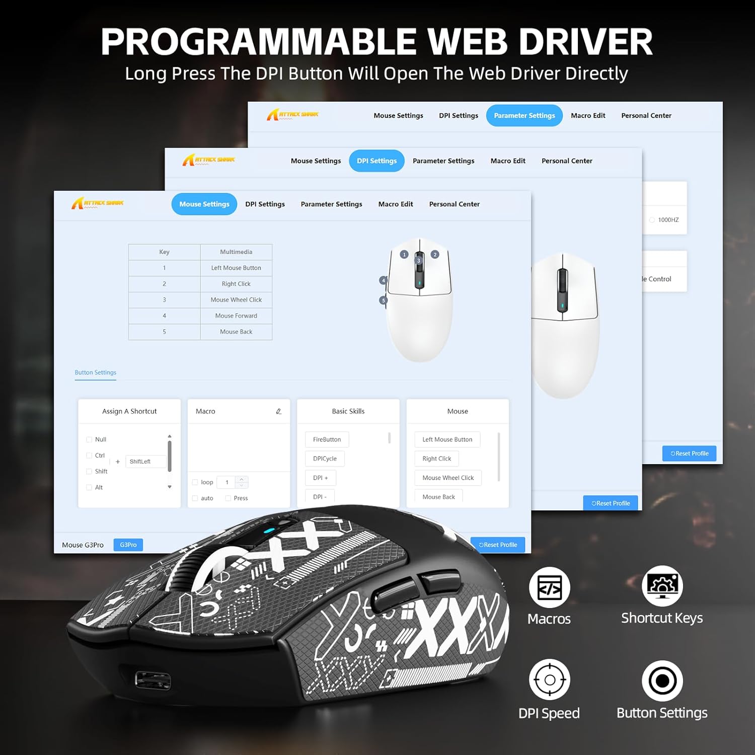 • Двоен драйвер: програмируемата мишка G3PRO има два драйвера: уеб драйвер (http://szslxd-tech.com/#/) и драйвер, разработен от самата ATTACK SHARK (изтегляне на драйвера: https://attackshark.com/pages/dirver-download). Конфигурирайте мишката си в драйвера, за да програмирате бутони, настройки на DPI, честота на заявките, макроси, LOD и други разширени функции. Можете безпроблемно да управлявате множество устройства и лесно да регулирате настройките на мишката.