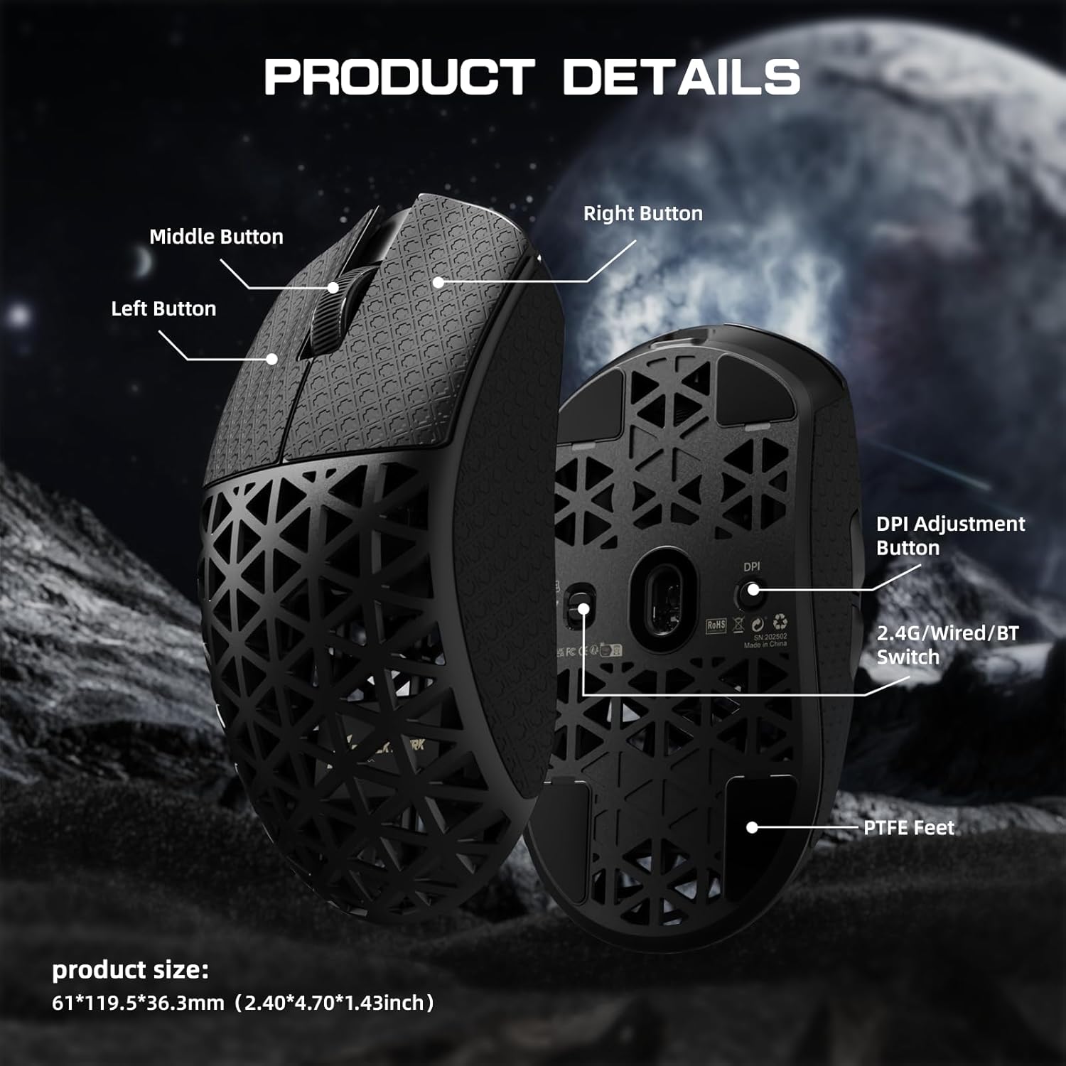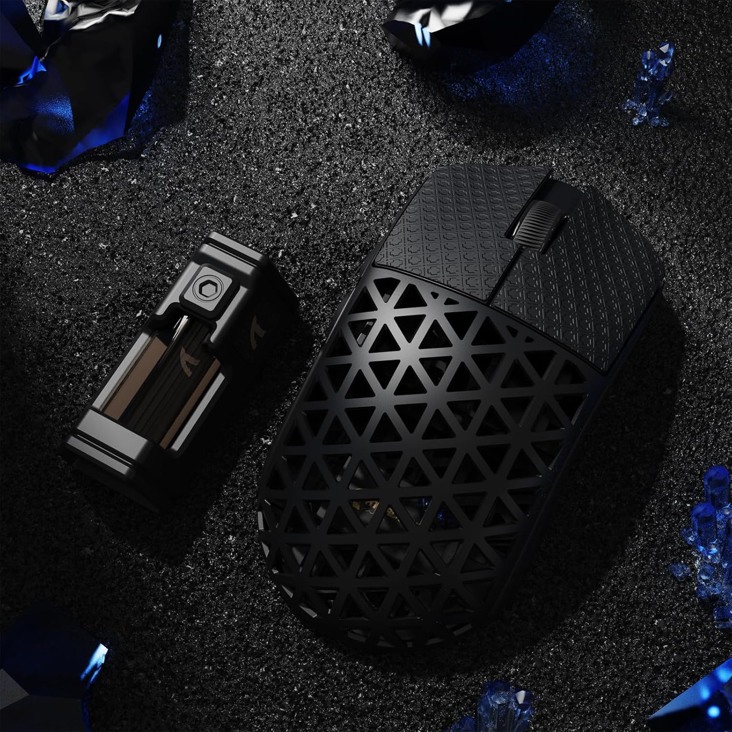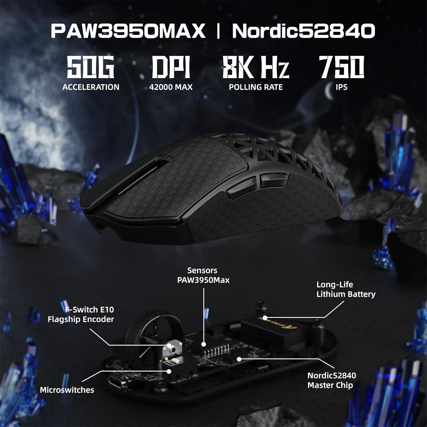 • PAW3950MAX СЕНЗОР С 8K БЕЗЖИЧНА ВРЪЗКА - Оборудван със сензора PixArt PAW3950 MAX и чип Nordic52840, той осигурява проследяване без забавяне чрез 8K безжичен (персонализиран приемник) или 1K кабелен режим и най-висока прецизност за бързи, състезателни игри. С 42 000 програмируеми DPI, 650 IPS и 50g ускорение - идеален за прецизни удари в главата или MMO магии.