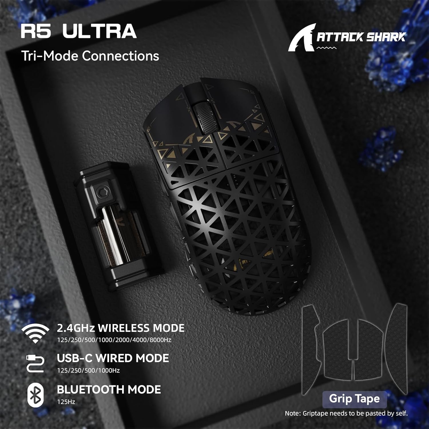 Безжична геймърска мишка ATTACK SHARK R5 Ultra Carbon Fiber HyperSpeed, 39g ултралека мишка с лента за захващане, 2.4G/BT/USB-C, PAW3950MAX сензор, 8000Hz безжична честота на семплиране, 42000DPI, Win/Mac - черна