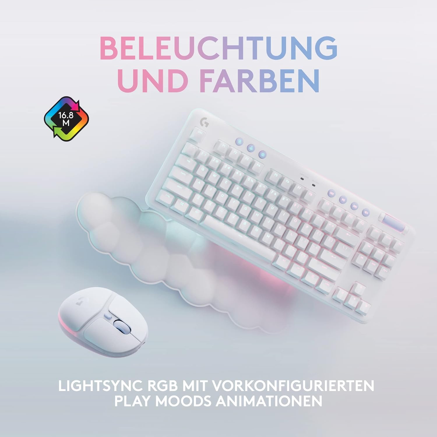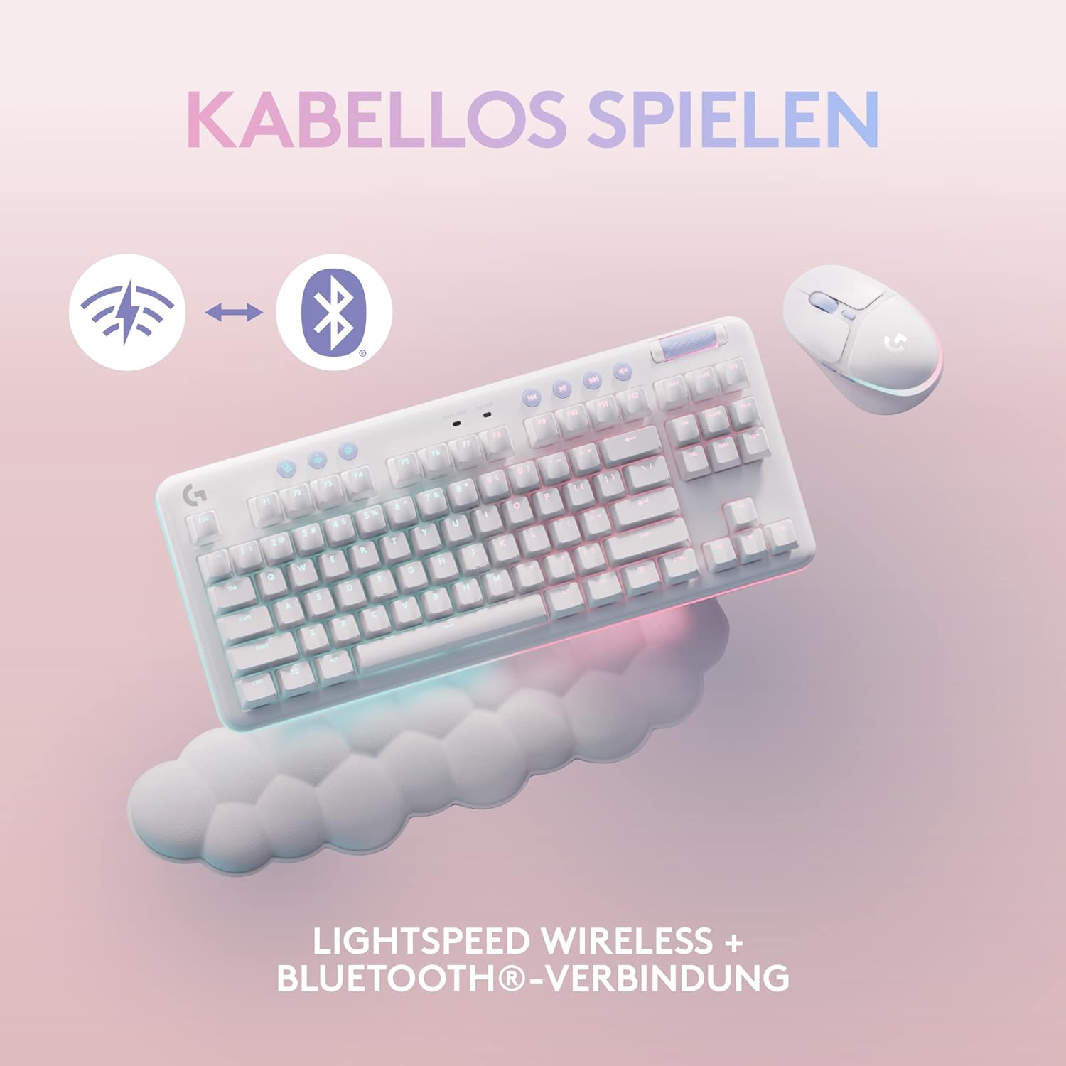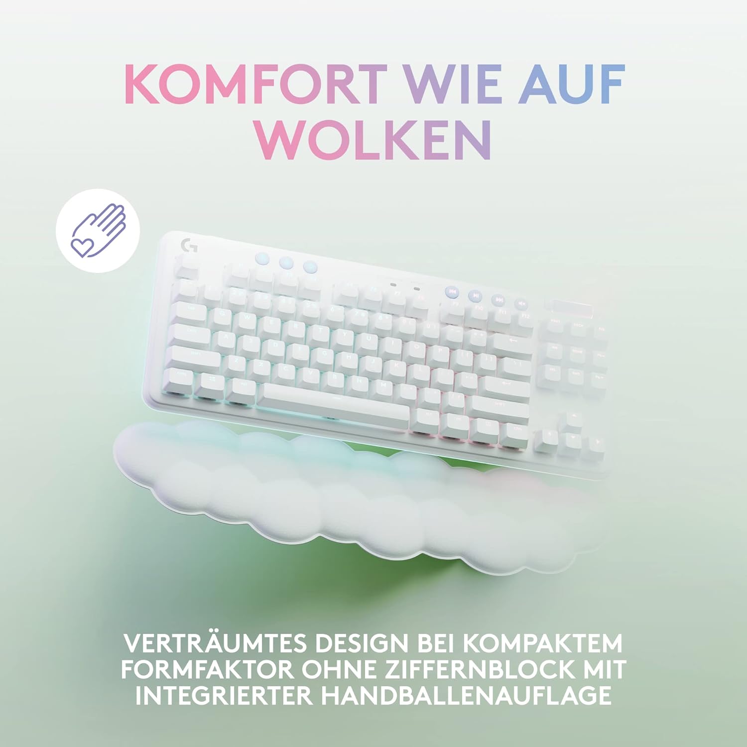 • Комфорт, нежен като облак: Потопете се в мечтателния бял дизайн на G715 и удобната му опора за длани във формата на облак; компактната механична клавиатура TKL и регулируемата височина осигуряват комфортно игрово изживяване през целия ден.