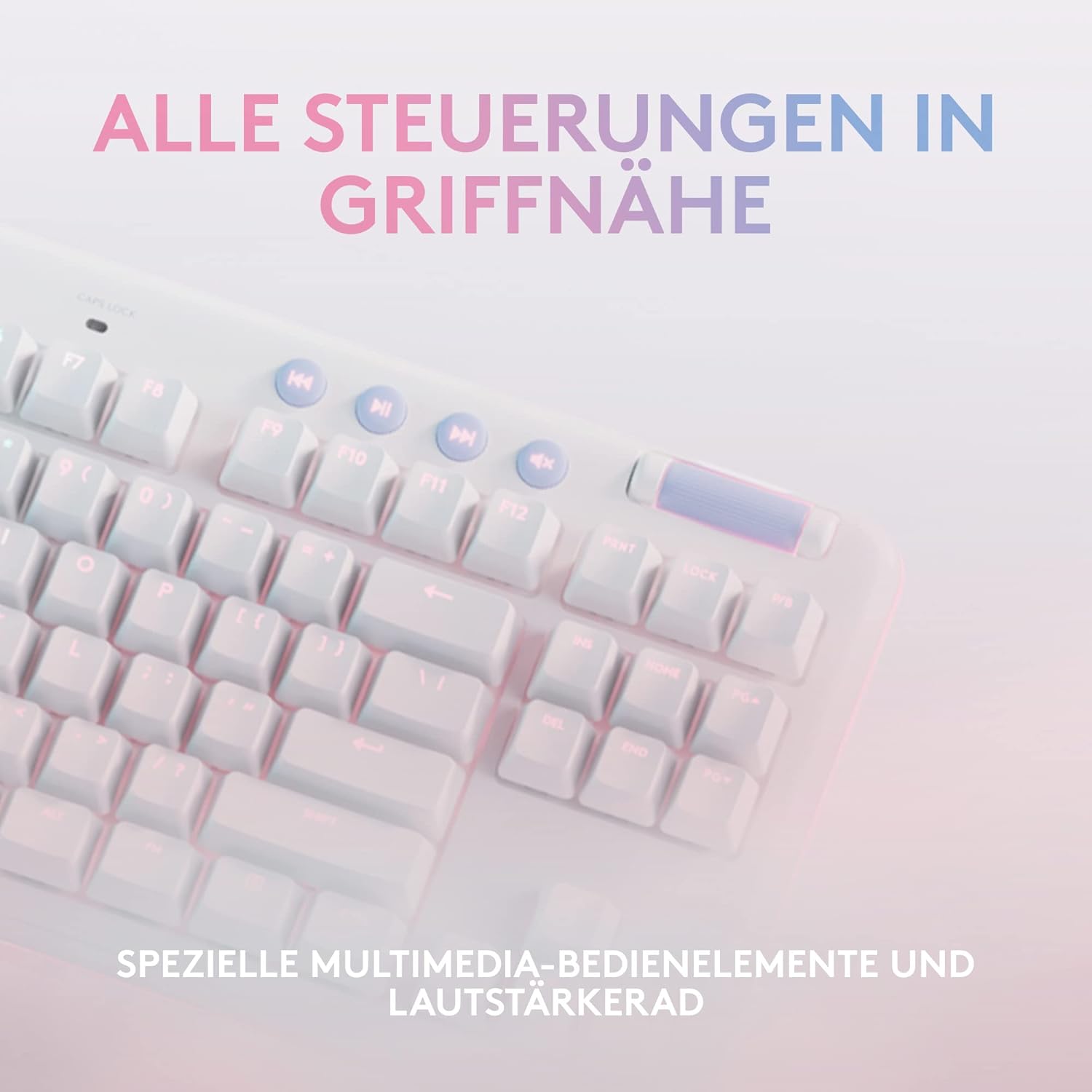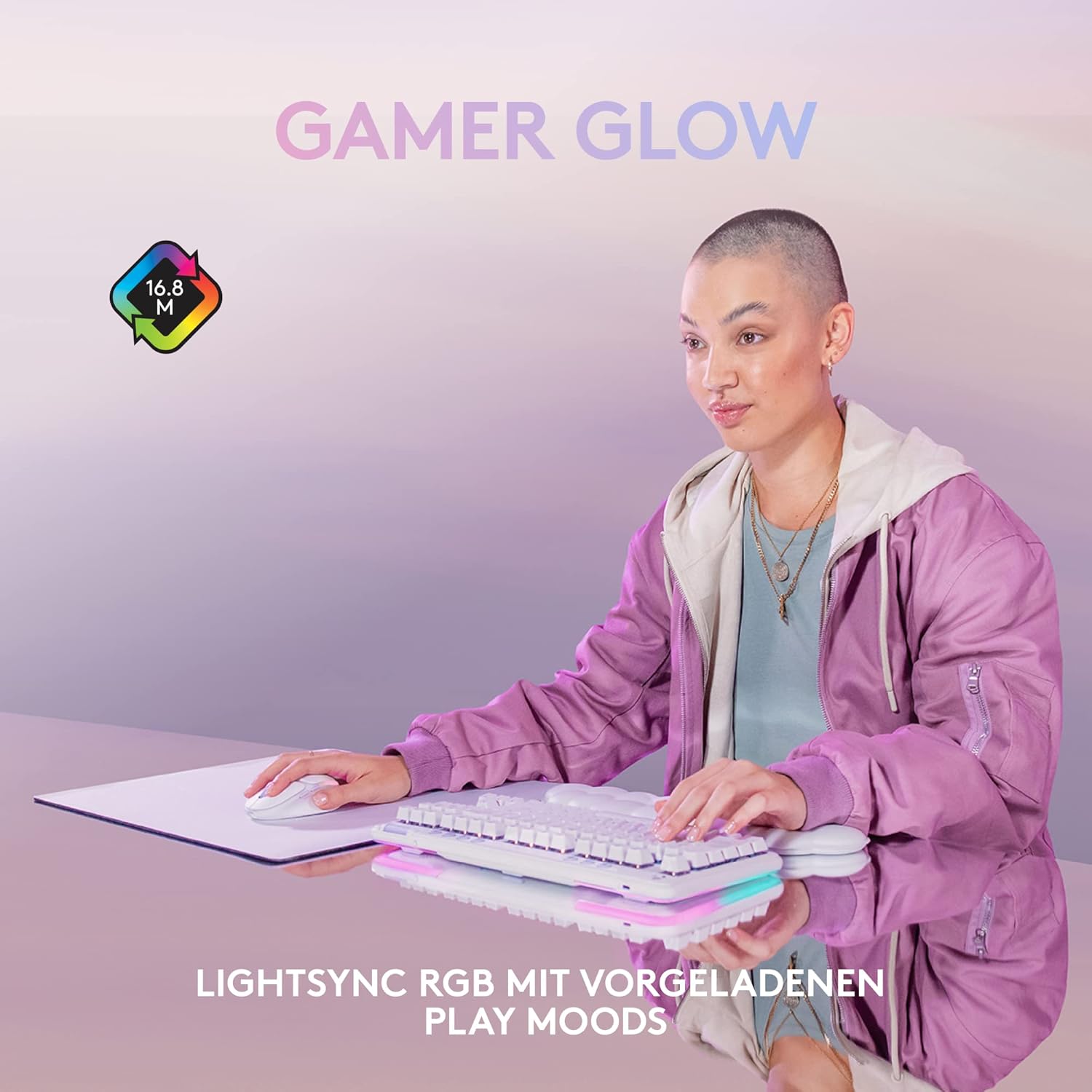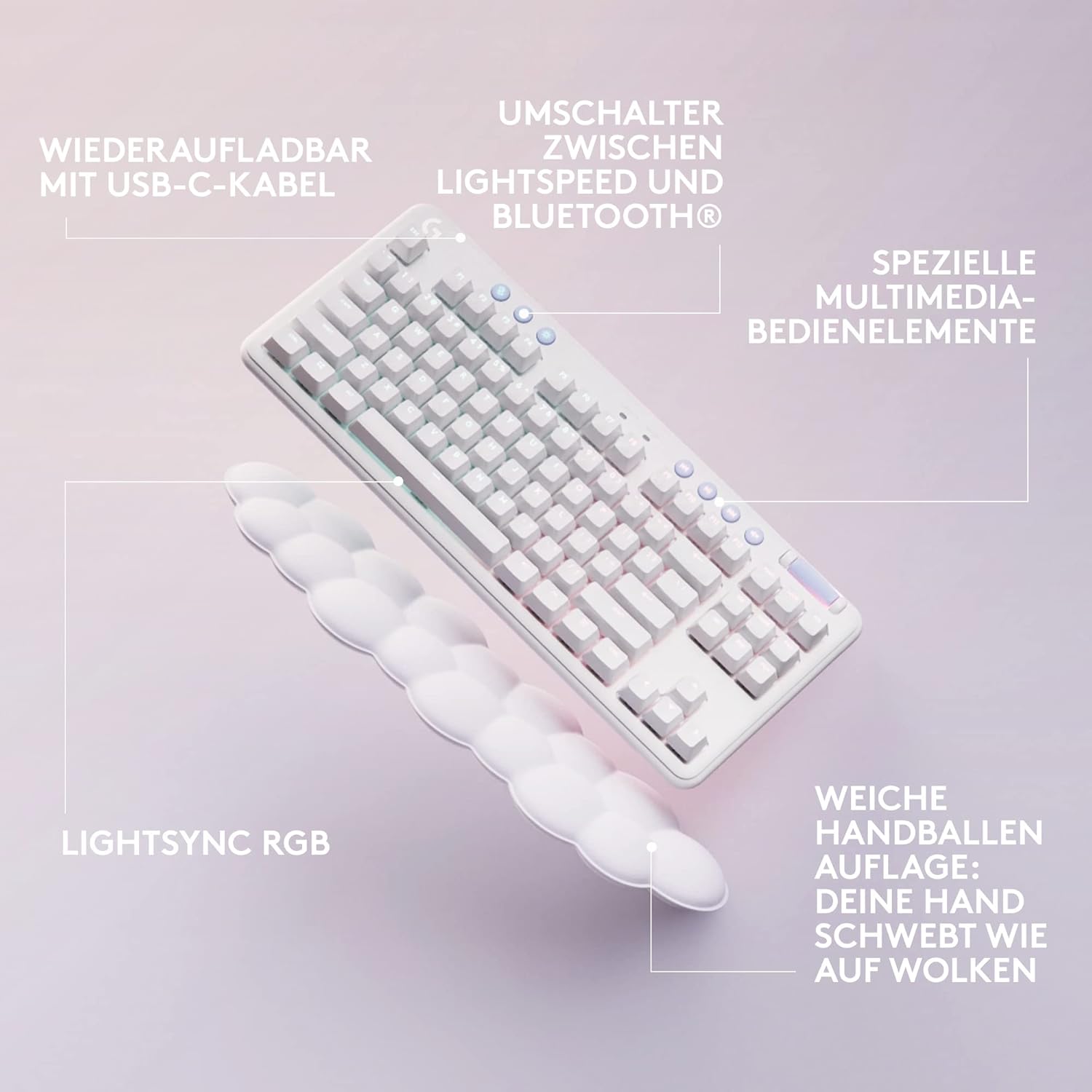 • Комфорт, нежен като облак: Потопете се в мечтателния бял дизайн на G715 и удобната му опора за длани във формата на облак; компактната механична клавиатура TKL и регулируемата височина осигуряват комфортно игрово изживяване през целия ден.