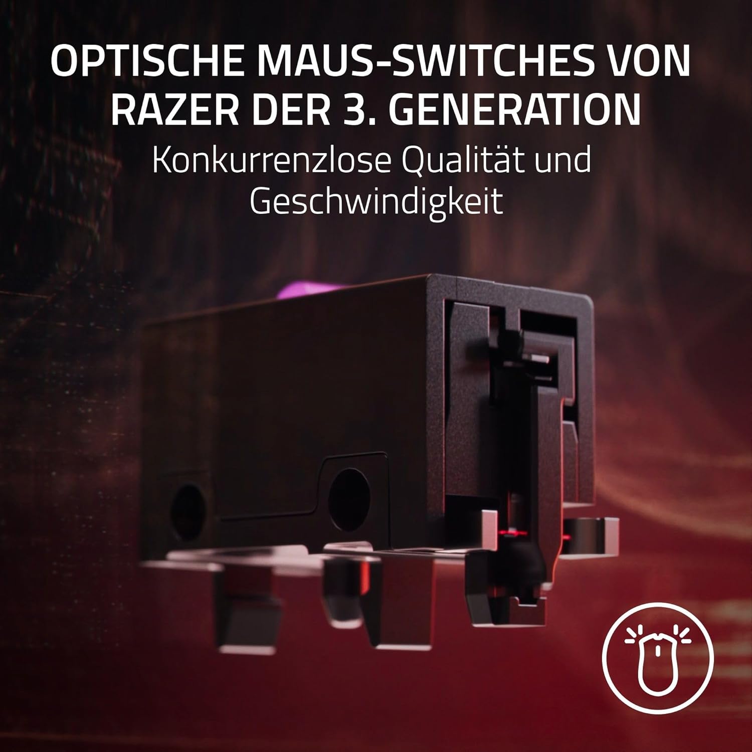 • Оптични превключватели за мишка от Razer, 3-то поколение. Ненадмината издръжливост и скорост: От още по-дълъг живот от 90 милиона кликвания и без грешни кликвания до невероятно кратко време на задействане от само 0,2 ms без забавяне при отскок, тази мишка предлага най-висока надеждност и скорост.