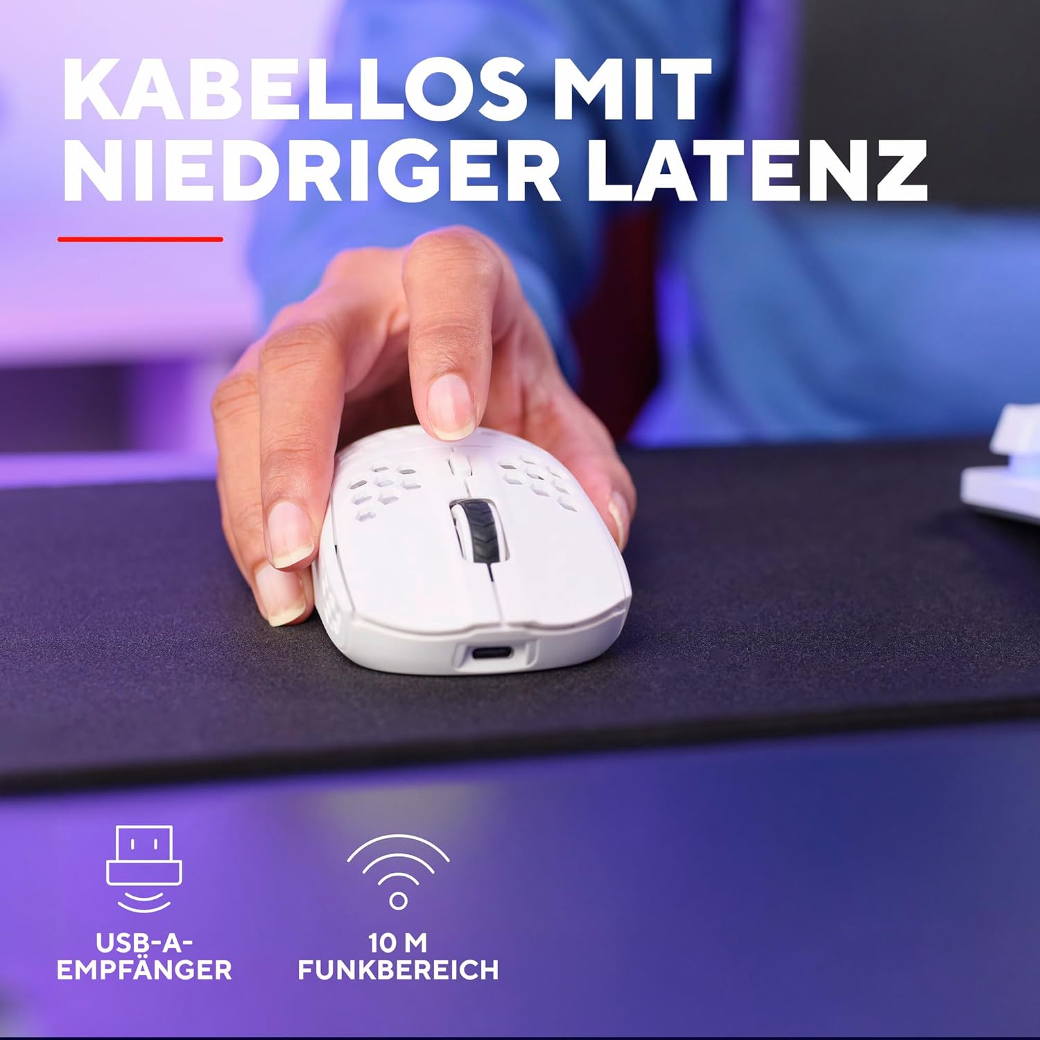 • Бърза реакция - Благодарение на безжичната връзка с ултра ниска латентност, движенията ви в играта са толкова бързи, колкото и в живота. Просто включете 2.4GHz micro USB приемника и започнете!