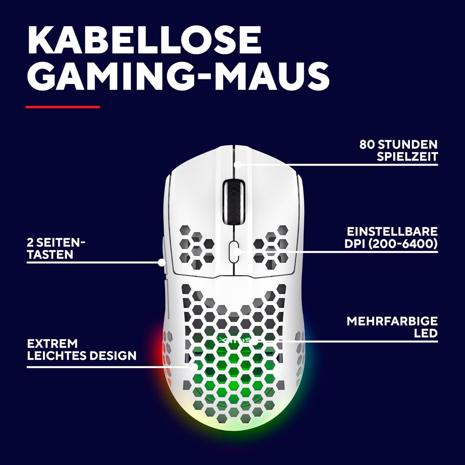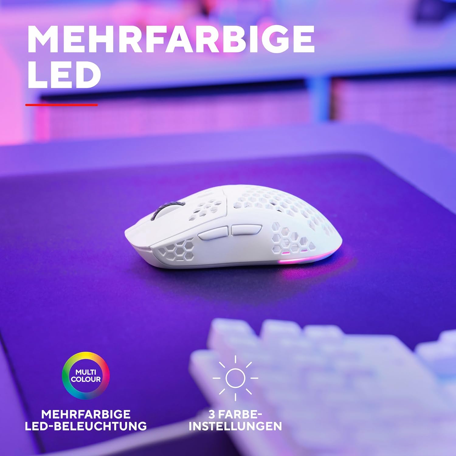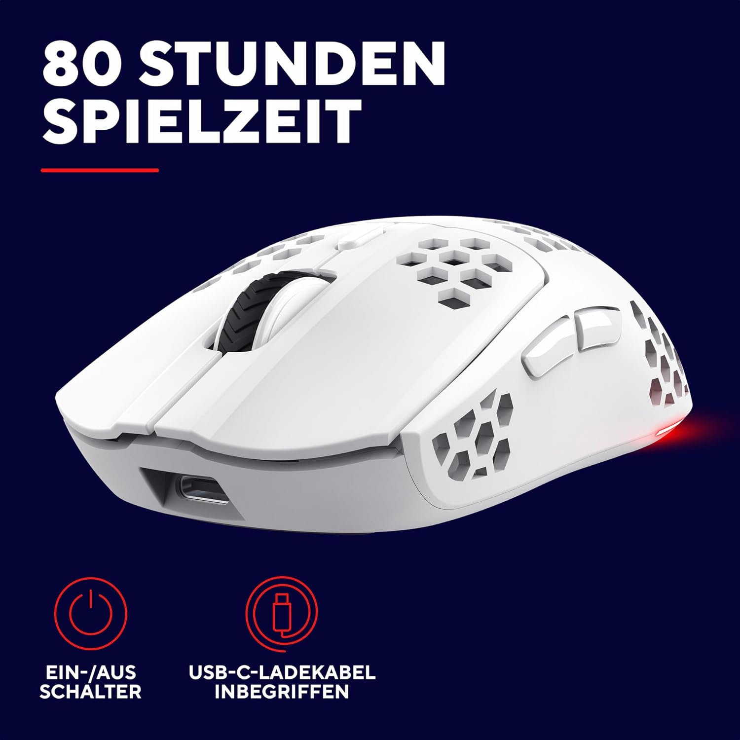 Безжична геймърска мишка Trust Gaming GXT 928 Helox, ултралека мишка 75 г, 80 часа непрекъсната употреба, 2.4 GHz micro USB приемник, регулируема DPI (800-4800), 6 програмируеми бутона, геймърска PC MMO - бяла