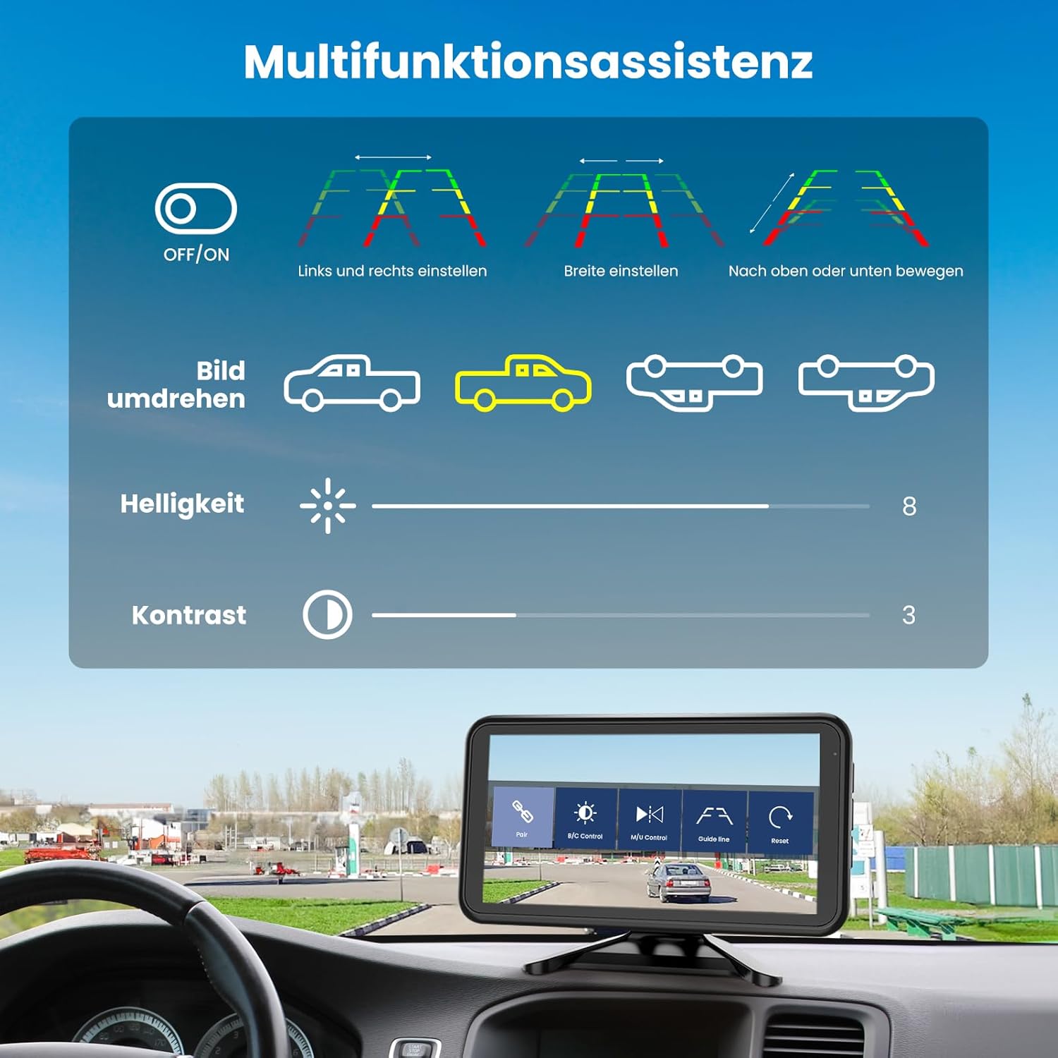 • Многофункционална камера за заден ход с монитор: Безжична камера за заден ход с регулируеми линии за паркиране и широкоъгълна функция, която помага за паркиране в тесни пространства. Можете също да регулирате яркостта, контраста, инверсията на изображението и др.