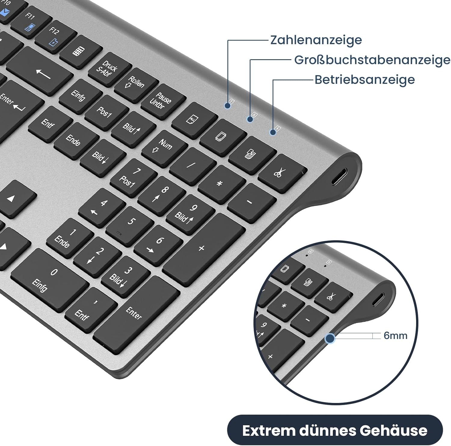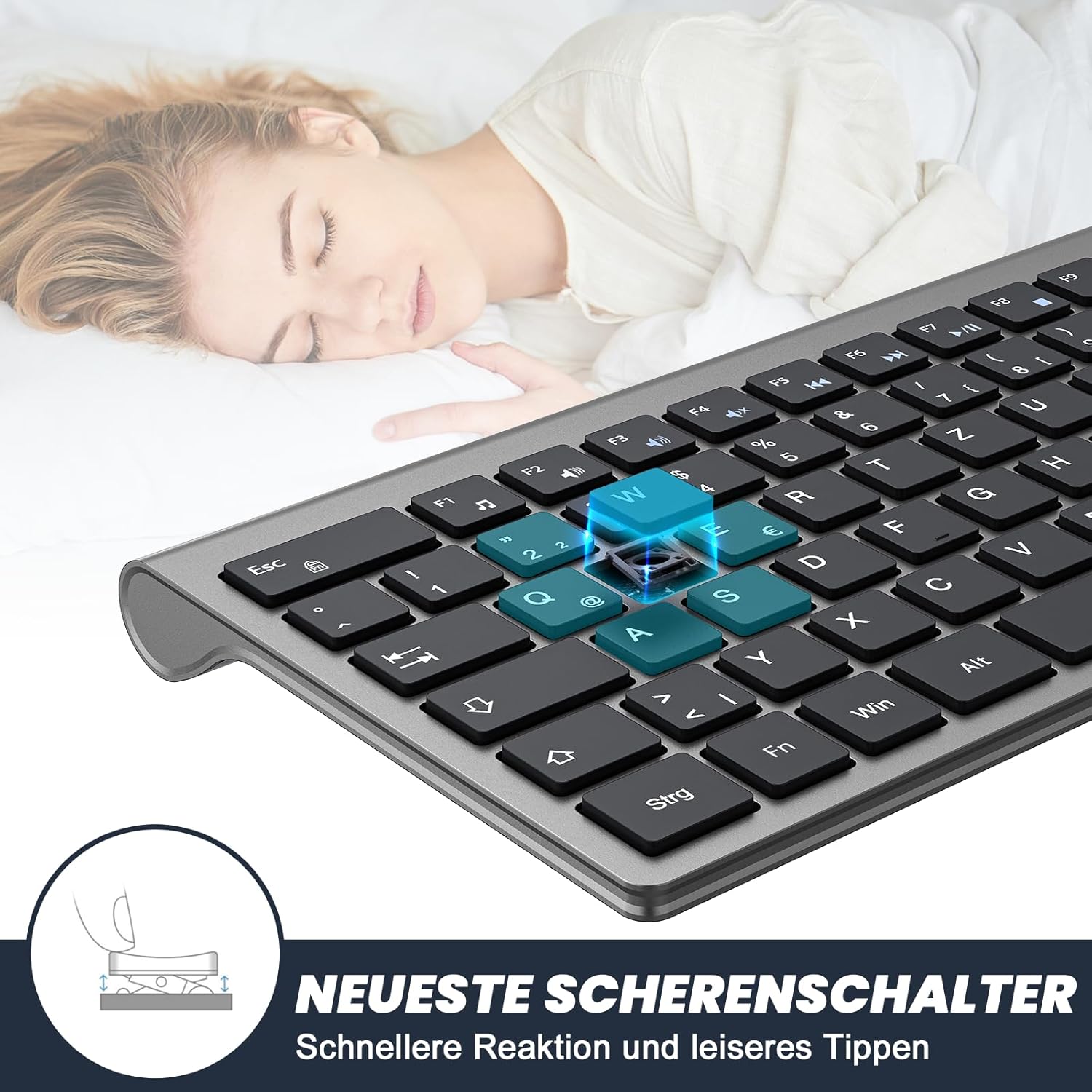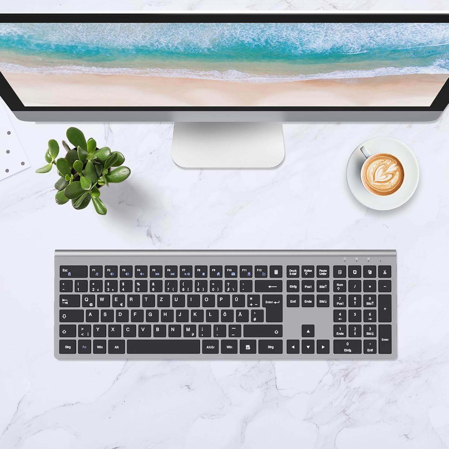 Безжична клавиатура cimetech с немска QWERTZ подредба, презареждаща се, пълноразмерна, ултратънка 2.4G безжична клавиатура с мултимедийни клавиши за компютър, лаптоп, Windows