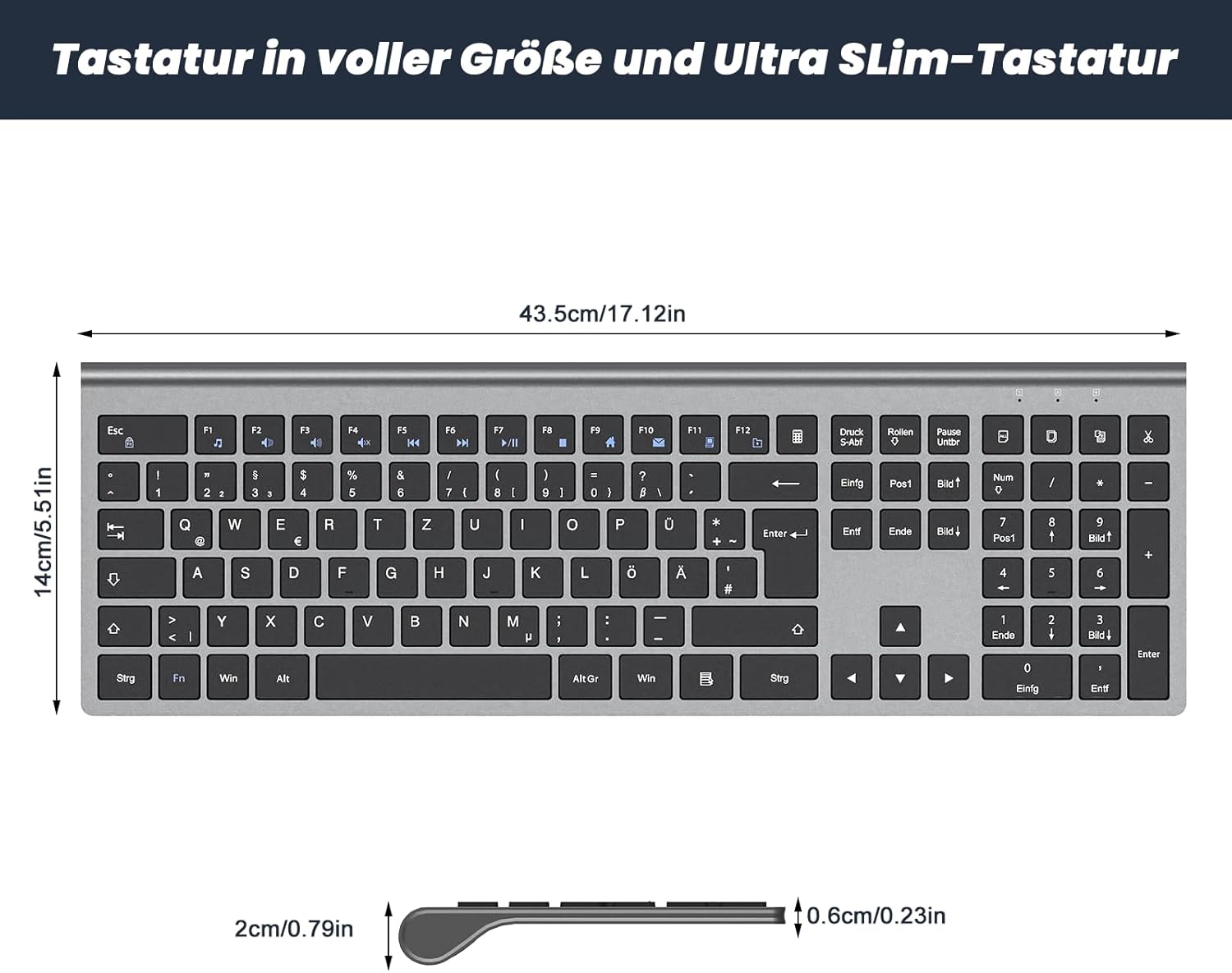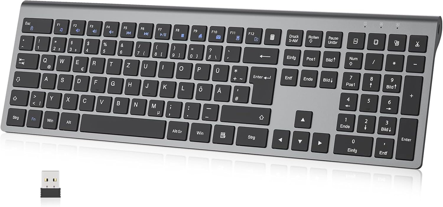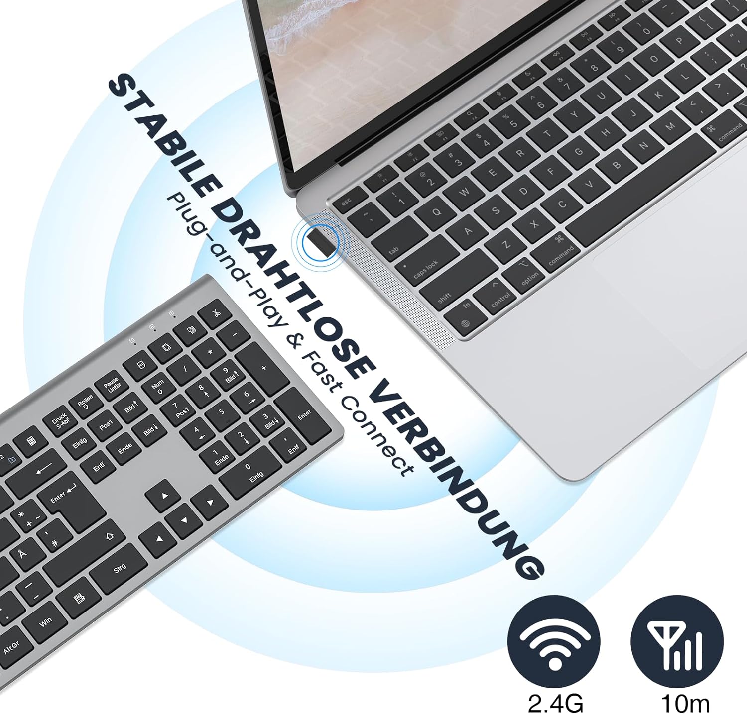 Безжична клавиатура cimetech с немска QWERTZ подредба, презареждаща се, пълноразмерна, ултратънка 2.4G безжична клавиатура с мултимедийни клавиши за компютър, лаптоп, Windows
