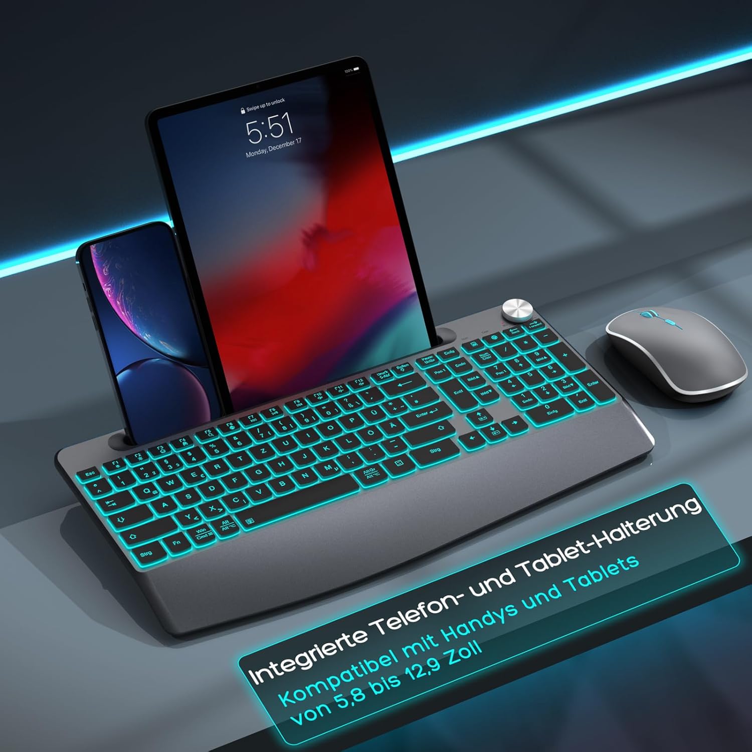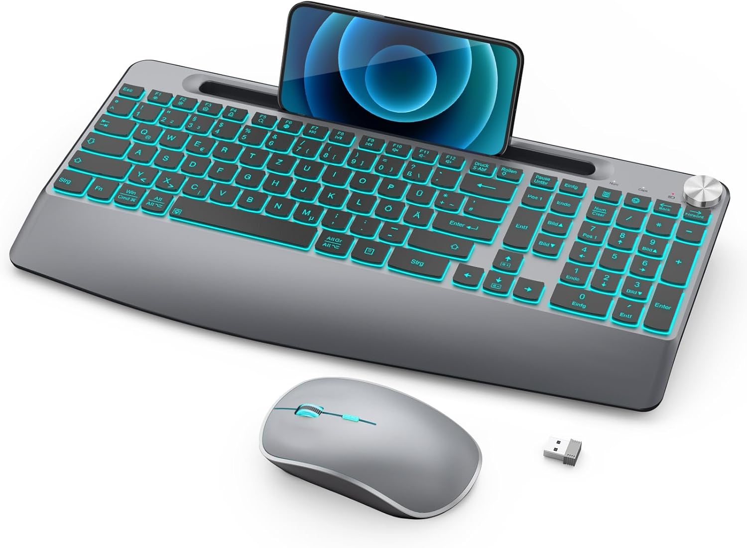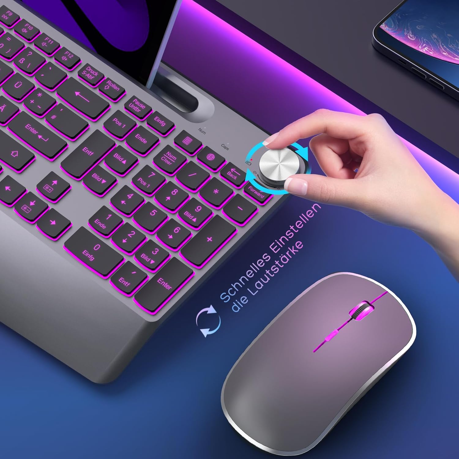 Безжична клавиатура и мишка - Презареждаща се клавиатура в пълен размер със 7 цвята, поставка за китката, държач за телефон, контрол на силата на звука, 2.4GHz клавиатура за компютър, лаптоп, PC, Mac, Windows - сива