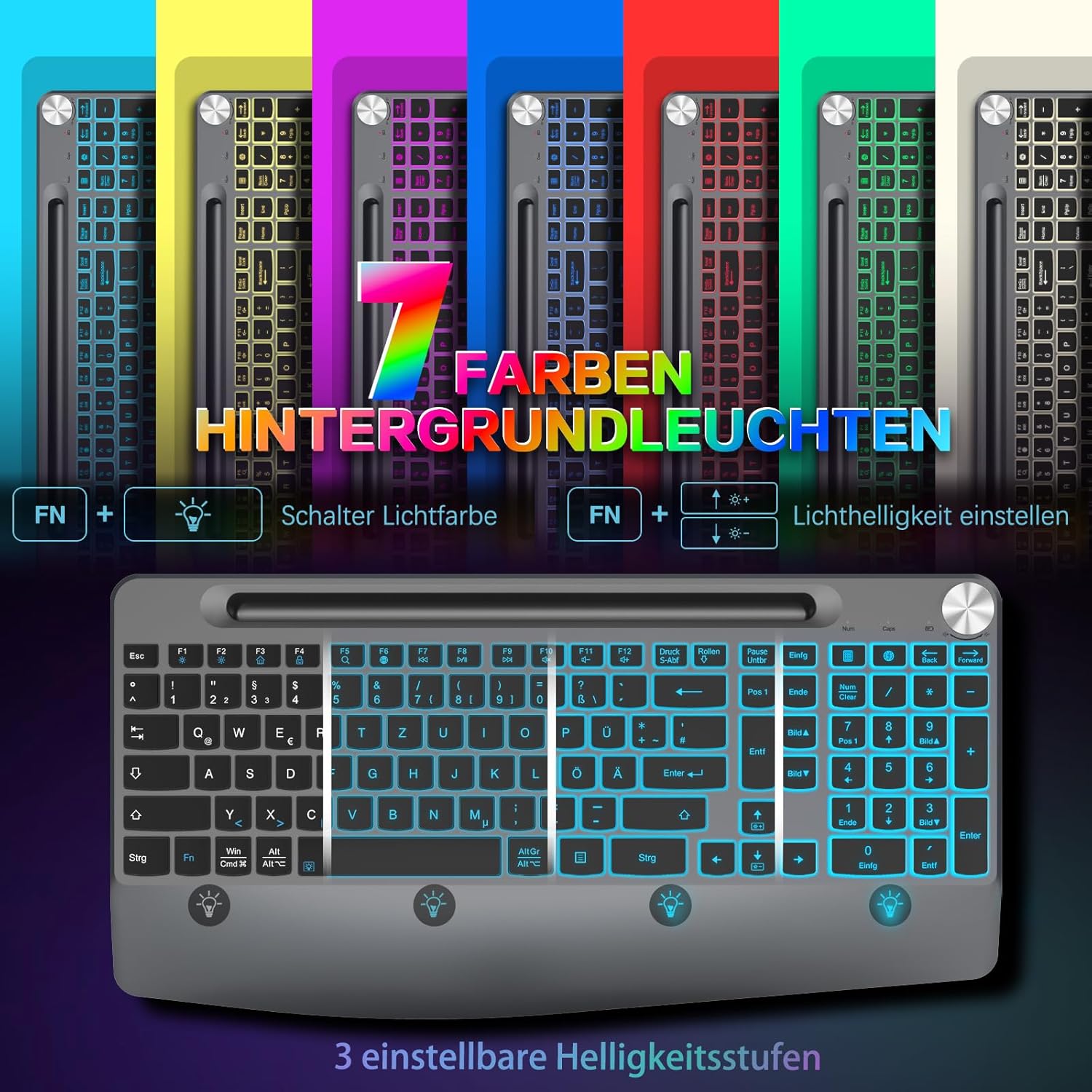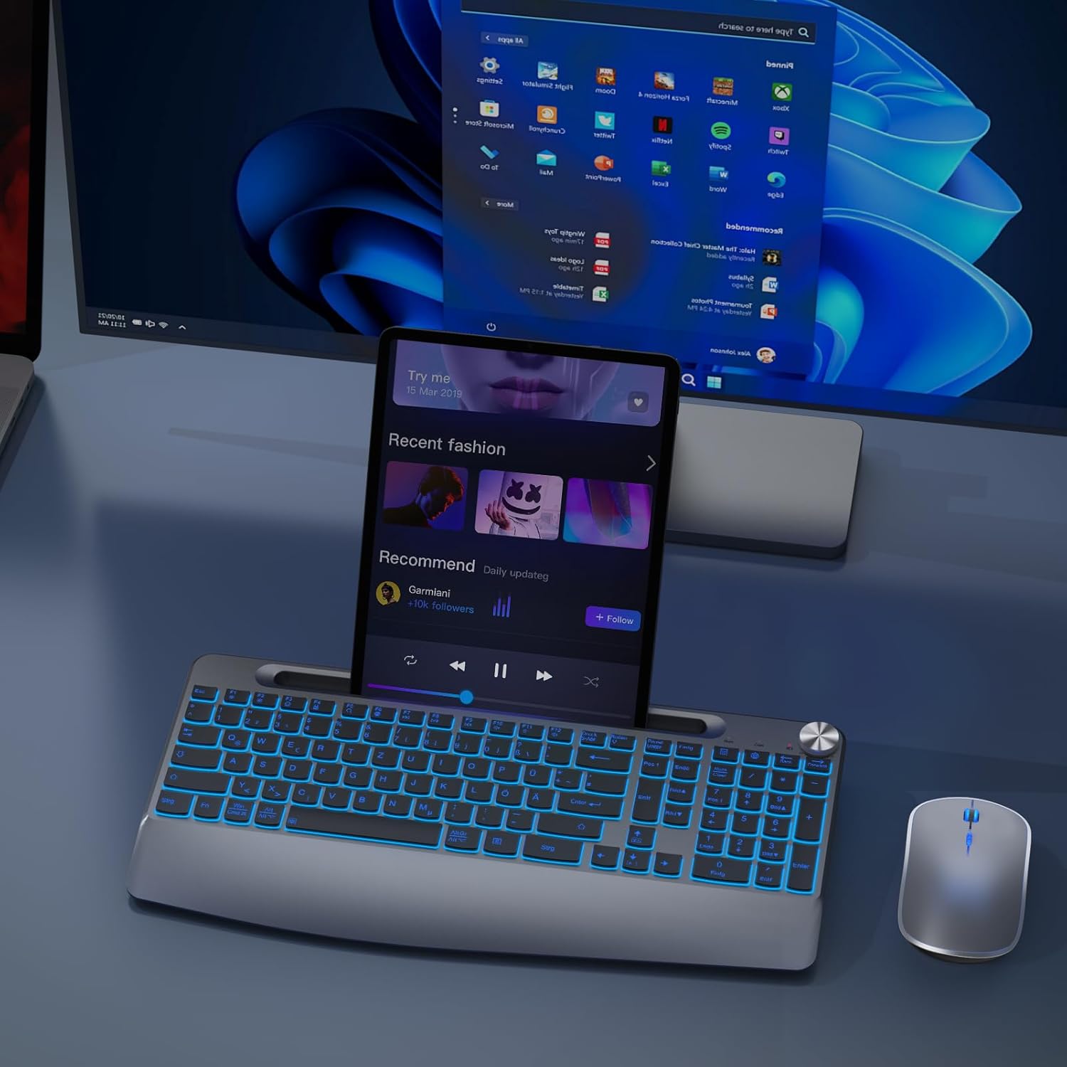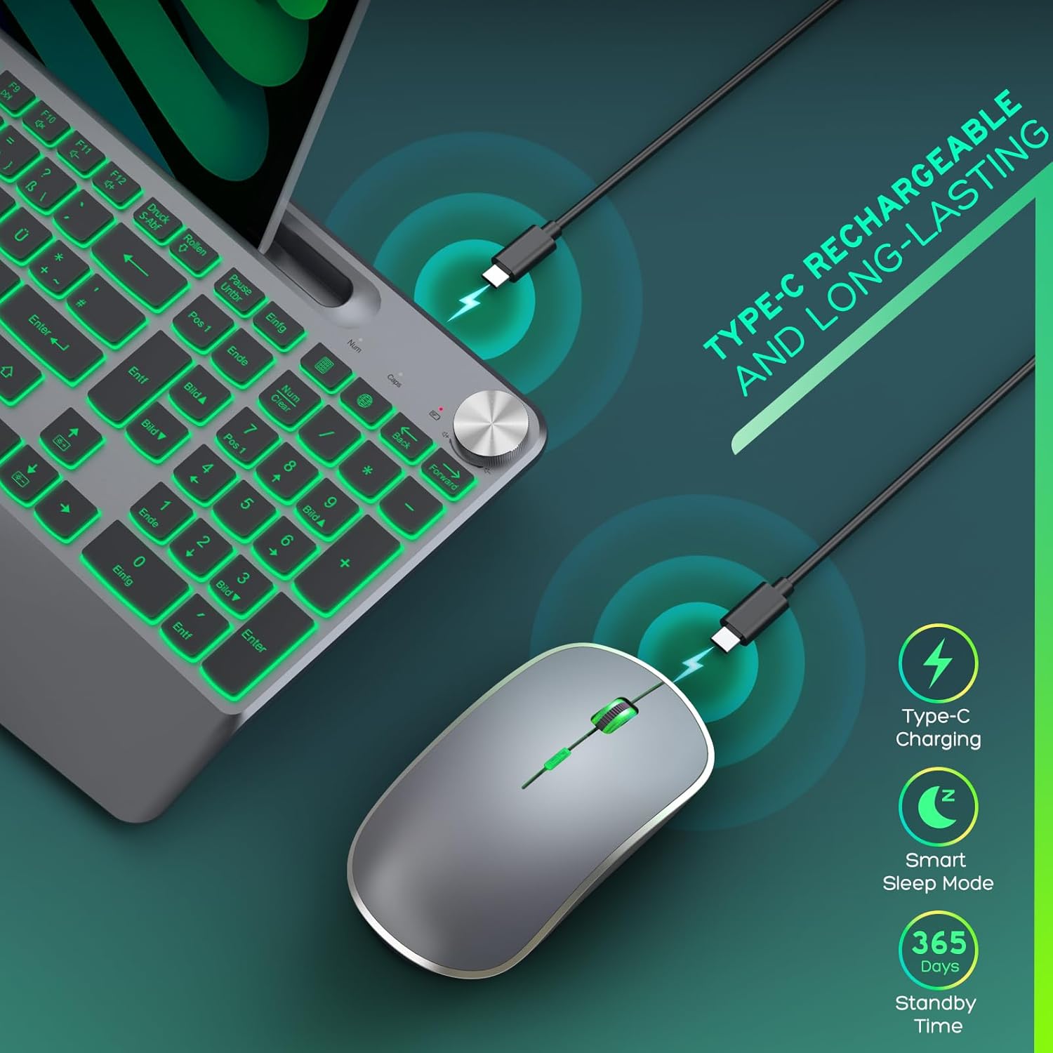Безжична клавиатура и мишка - Презареждаща се клавиатура в пълен размер със 7 цвята, поставка за китката, държач за телефон, контрол на силата на звука, 2.4GHz клавиатура за компютър, лаптоп, PC, Mac, Windows - сива