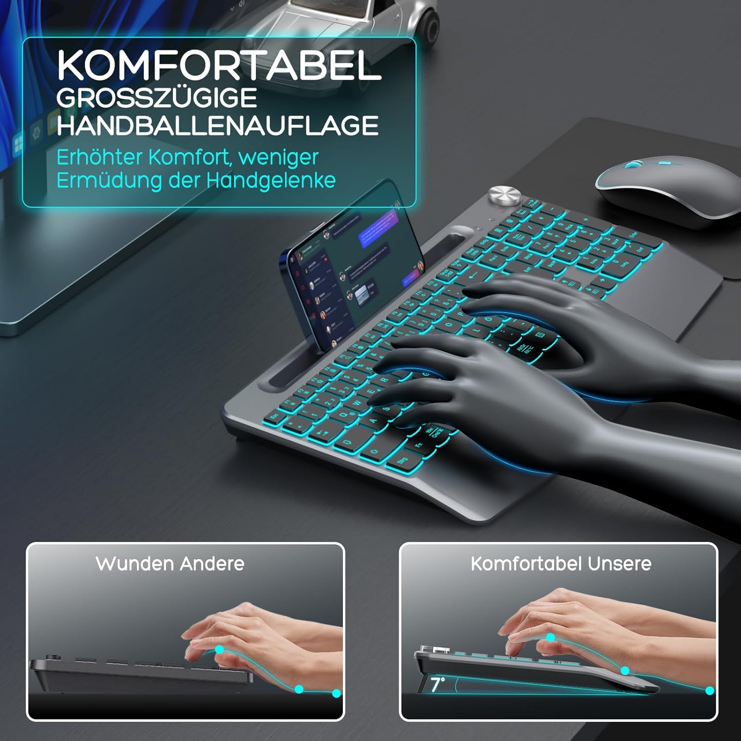 • 【Ергономичен дизайн с поставка за китката】Комбинацията от безжична клавиатура и мишка предлага удобно писане. Ергономичният дизайн на клавиатурата с поставка за китката и сгъваема скоба е щателно изработен, за да пасне перфектно на ръката ви. Ергономичната безжична мишка е проектирана да се съобразява с естествените контури на ръката, намалявайки напрежението върху китките и мускулите на ръката.